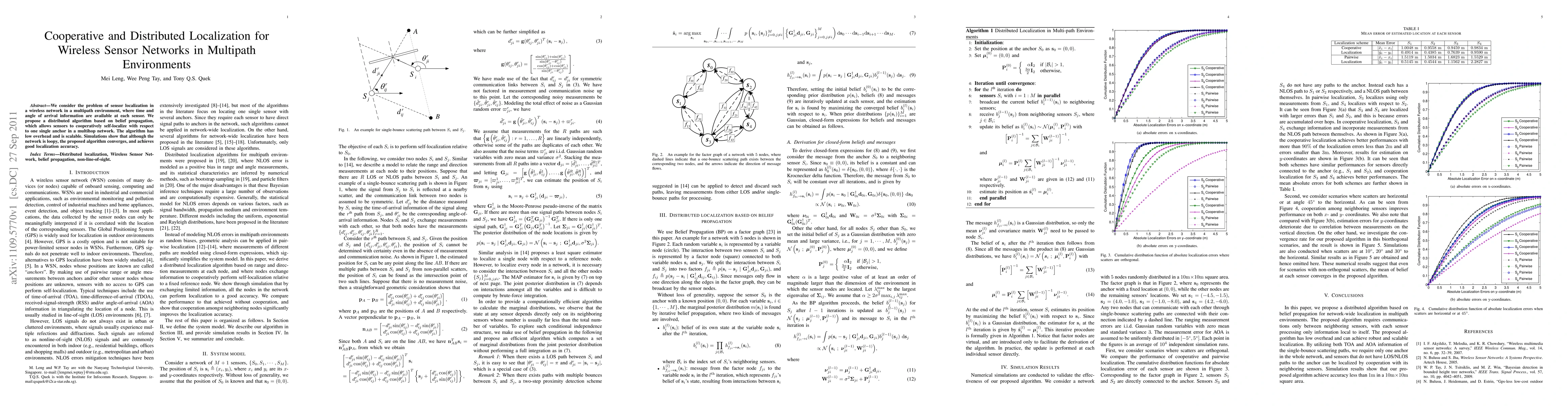 This paper proposes a distributed localization algorithm for wireless sensor networks in multipath environments, utilizing belief propagation for cooperative self-localization with respect to a single anchor. The algorithm demonstrates low overhead, scalability, and effective convergence with high localization accuracy in loopy networks.