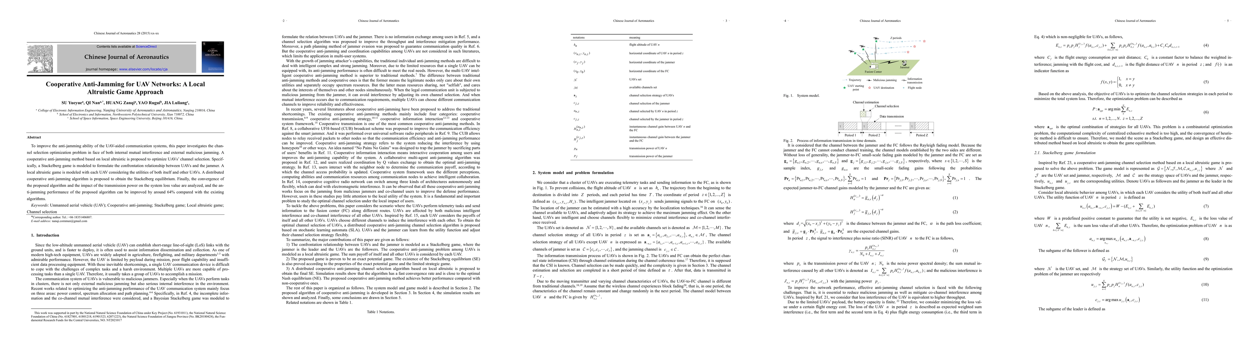 This paper proposes a cooperative anti-jamming method using a local altruistic game to optimize UAVs' channel selection for enhanced resilience against interference and jamming. The approach employs a Stackelberg game to model interactions between UAVs and a jammer, and a distributed algorithm achieves the Stackelberg equilibrium, improving anti-jamming performance by approximately 64% compared to existing methods.