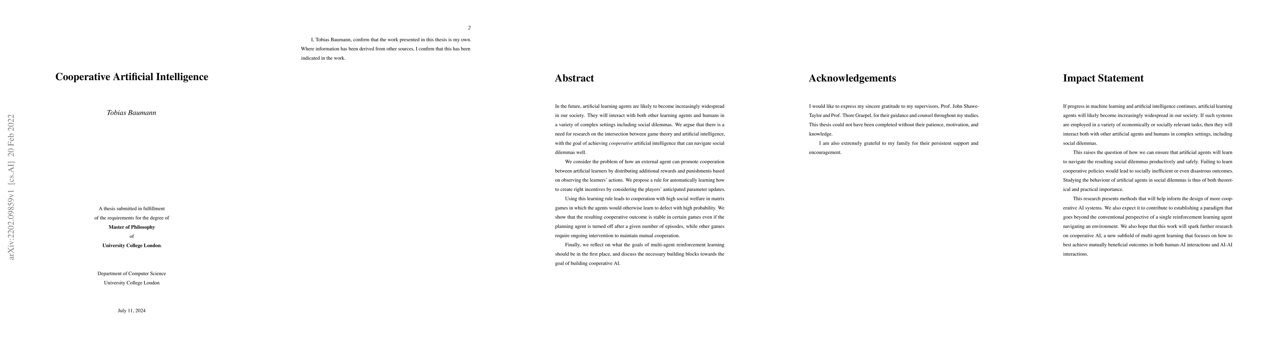 This paper explores the intersection of game theory and artificial intelligence to develop cooperative AI capable of navigating social dilemmas. It proposes a learning rule for an external agent to promote cooperation among artificial learners through reward and punishment distribution, achieving high social welfare in matrix games.
