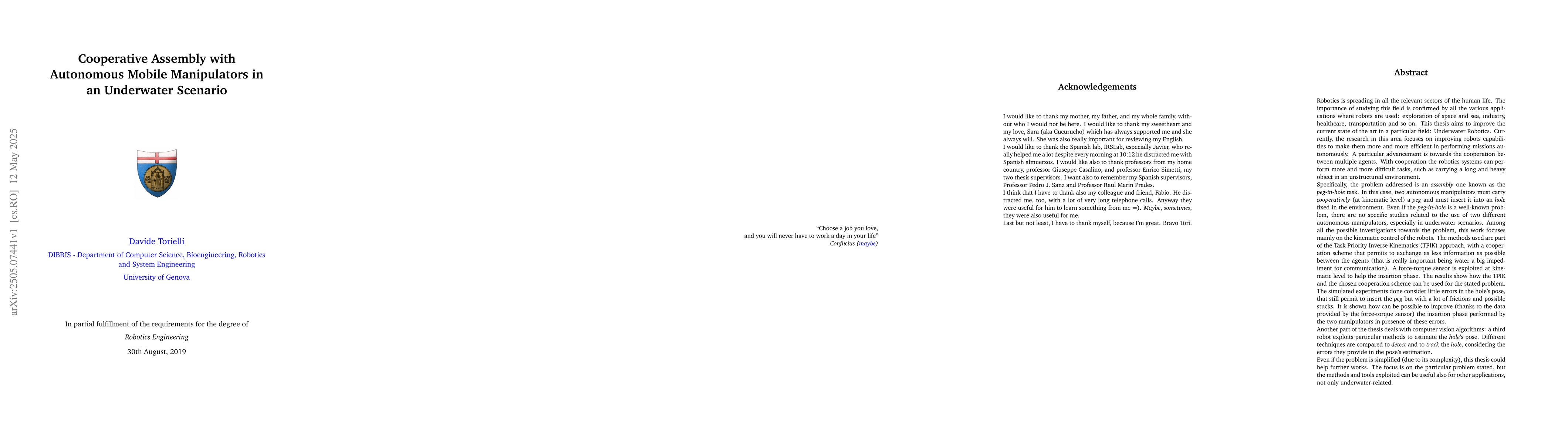 [...] Specifically, the problem addressed is an assembly one known as the peg-in-hole task. In this case, two autonomous manipulators must carry cooperatively (at kinematic level) a peg and must insert it into an hole fixed in the environment. Even if the peg-in-hole is a well-known problem, there are no specific studies related to the use of two different autonomous manipulators, especially in underwater scenarios. Among all the possible investigations towards the problem, this work focuses mainly on the kinematic control of the robots. The methods used are part of the Task Priority Inverse Kinematics (TPIK) approach, with a cooperation scheme that permits to exchange as less information as possible between the agents (that is really important being water a big impediment for communication). A force-torque sensor is exploited at kinematic level to help the insertion phase. The results show how the TPIK and the chosen cooperation scheme can be used for the stated problem. The simulated experiments done consider little errors in the hole's pose, that still permit to insert the peg but with a lot of frictions and possible stucks. It is shown how can be possible to improve (thanks to the data provided by the force-torque sensor) the insertion phase performed by the two manipulators in presence of these errors. [...]