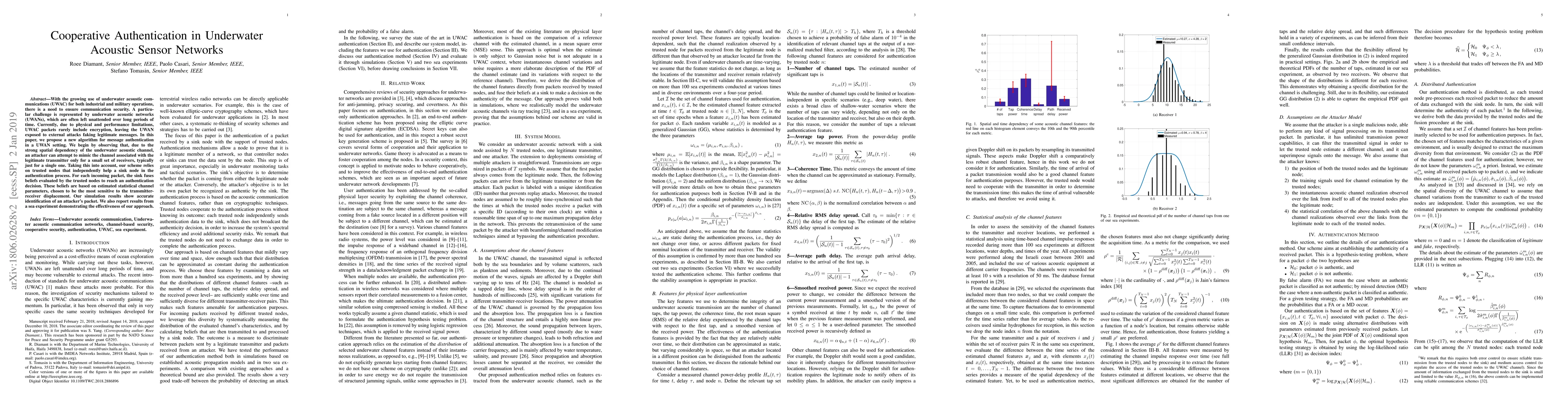 With the growing use of underwater acoustic communications (UWAC) for both industrial and military operations, there is a need to ensure communication security. A particular challenge is represented by underwater acoustic networks (UWANs), which are often left unattended over long periods of time. Currently, due to physical and performance limitations, UWAC packets rarely include encryption, leaving the UWAN exposed to external attacks faking legitimate messages. In this paper, we propose a new algorithm for message authentication in a UWAN setting. We begin by observing that, due to the strong spatial dependency of the underwater acoustic channel, an attacker can attempt to mimic the channel associated with the legitimate transmitter only for a small set of receivers, typically just for a single one. Taking this into account, our scheme relies on trusted nodes that independently help a sink node in the authentication process. For each incoming packet, the sink fuses beliefs evaluated by the trusted nodes to reach an authentication decision. These beliefs are based on estimated statistical channel parameters, chosen to be the most sensitive to the transmitter-receiver displacement. Our simulation results show accurate identification of an attacker's packet. We also report results from a sea experiment demonstrating the effectiveness of our approach.