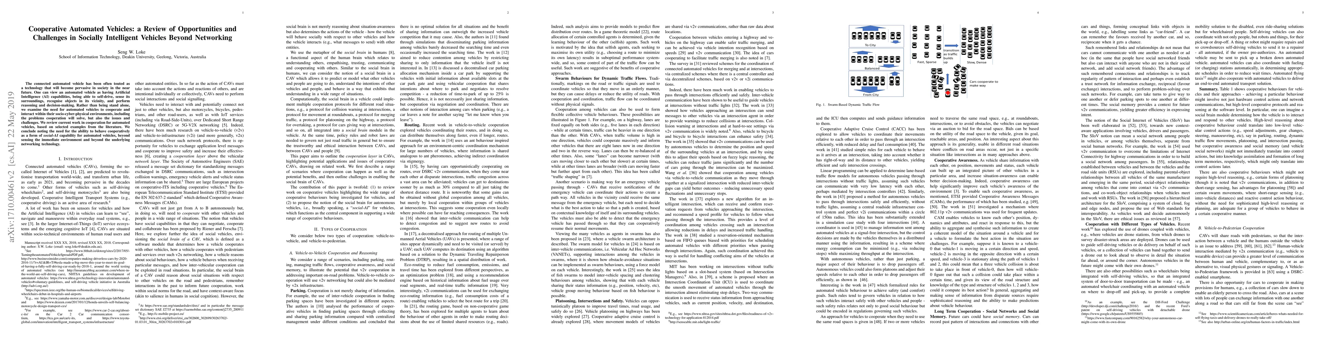 This paper reviews the opportunities and challenges of cooperative automated vehicles, emphasizing the necessity for vehicles to interact and cooperate within their socio-cyber-physical environments. It highlights the importance of social-AI capabilities beyond basic networking and immediate environment sensing.