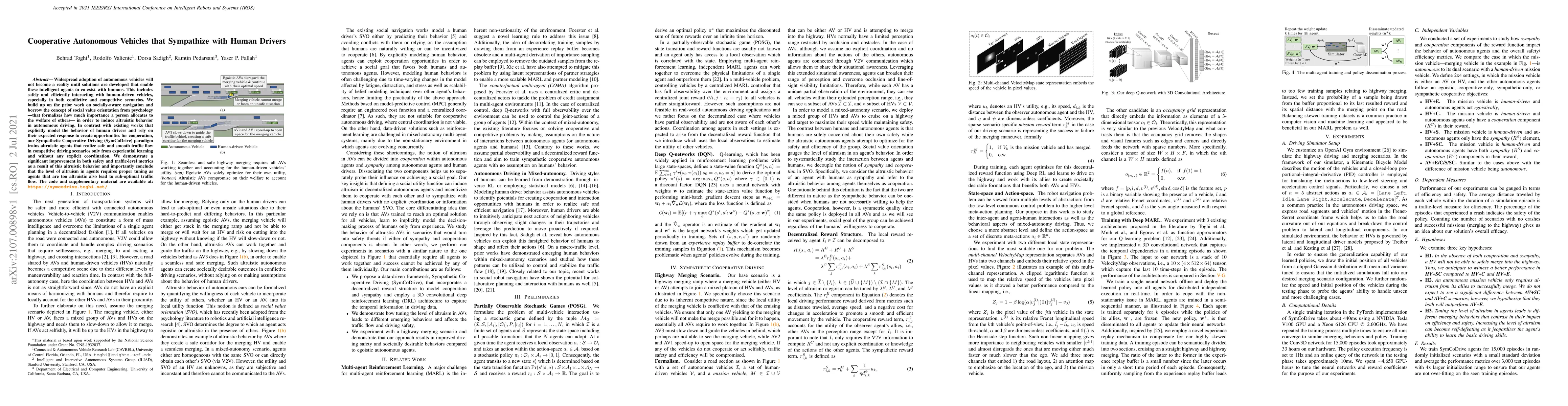 Widespread adoption of autonomous vehicles will not become a reality until solutions are developed that enable these intelligent agents to co-exist with humans. This includes safely and efficiently interacting with human-driven vehicles, especially in both conflictive and competitive scenarios. We build up on the prior work on socially-aware navigation and borrow the concept of social value orientation from psychology -- that formalizes how much importance a person allocates to the welfare of others -- in order to induce altruistic behavior in autonomous driving. In contrast with existing works that explicitly model the behavior of human drivers and rely on their expected response to create opportunities for cooperation, our Sympathetic Cooperative Driving (SymCoDrive) paradigm trains altruistic agents that realize safe and smooth traffic flow in competitive driving scenarios only from experiential learning and without any explicit coordination. We demonstrate a significant improvement in both safety and traffic-level metrics as a result of this altruistic behavior and importantly conclude that the level of altruism in agents requires proper tuning as agents that are too altruistic also lead to sub-optimal traffic flow. The code and supplementary material are available at: https://symcodrive.toghi.net/