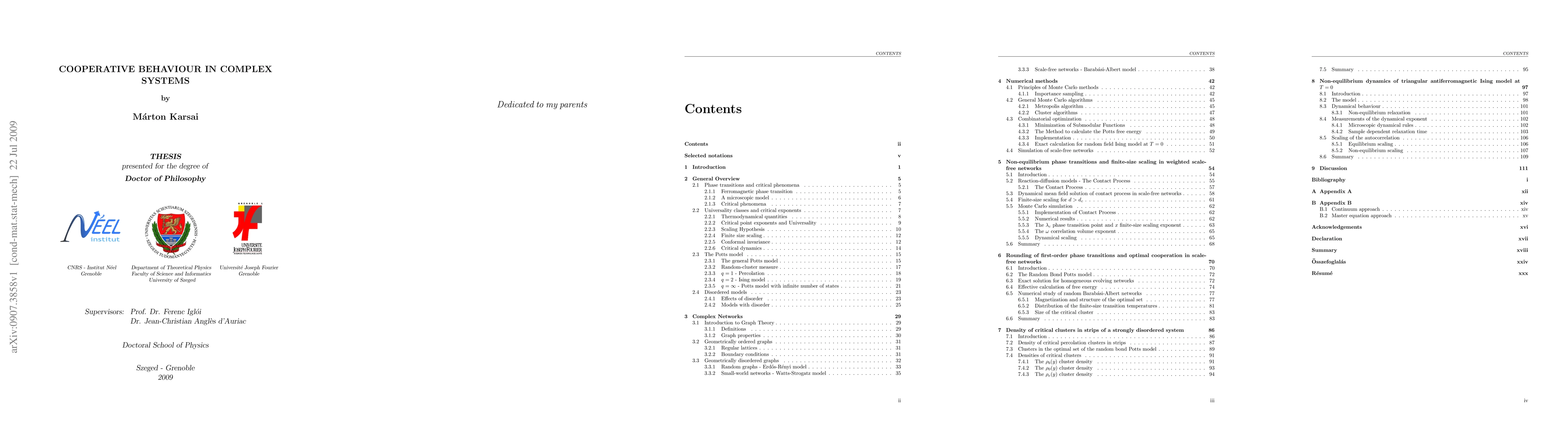 In my PhD thesis I studied cooperative phenomena arise in complex systems using the methods of statistical and computational physics. The aim of my work was also to study the critical behaviour of interacting many-body systems during their phase transitions and describe their universal features analytically and by means of numerical calculations. In order to do so I completed studies in four different subjects. My first investigated subject was a study of non-equilibrium phase transitions in weighted scale-free networks. The second problem I examined was the ferromagnetic random bond Potts model with large values of q on evolving scale-free networks which problem is equivalent to an optimal cooperation problem. The third examined problem was related to the large-q sate random bond Potts model also and I examined the critical density of clusters which touched a certain border of a perpendicular strip like geometry and expected to hold analytical forms deduced from conformal invariance. The last investigated problem was a study of the non-equilibrium dynamical behaviour of the antiferromagnetic Ising model on two-dimensional triangular lattice at zero temperature in the absence of external field and at the Kosterlitz-Thouless phase transition point.