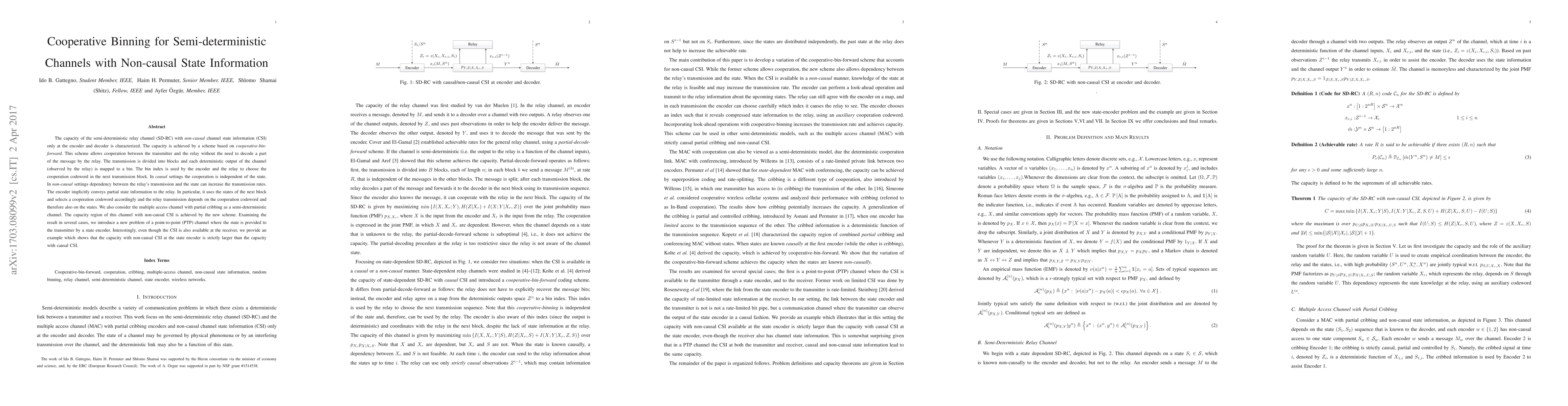 The capacity of the semi-deterministic relay channel (SD-RC) with non-causal channel state information (CSI) only at the encoder and decoder is characterized. The capacity is achieved by a scheme based on cooperative-bin-forward. This scheme allows cooperation between the transmitter and the relay without the need to decode a part of the message by the relay. The transmission is divided into blocks and each deterministic output of the channel (observed by the relay) is mapped to a bin. The bin index is used by the encoder and the relay to choose the cooperation codeword in the next transmission block. In causal settings the cooperation is independent of the state. In \emph{non-causal} settings dependency between the relay's transmission and the state can increase the transmission rates. The encoder implicitly conveys partial state information to the relay. In particular, it uses the states of the next block and selects a cooperation codeword accordingly and the relay transmission depends on the cooperation codeword and therefore also on the states. We also consider the multiple access channel with partial cribbing as a semi-deterministic channel. The capacity region of this channel with non-causal CSI is achieved by the new scheme. Examining the result in several cases, we introduce a new problem of a point-to-point (PTP) channel where the state is provided to the transmitter by a state encoder. Interestingly, even though the CSI is also available at the receiver, we provide an example which shows that the capacity with non-causal CSI at the state encoder is strictly larger than the capacity with causal CSI.