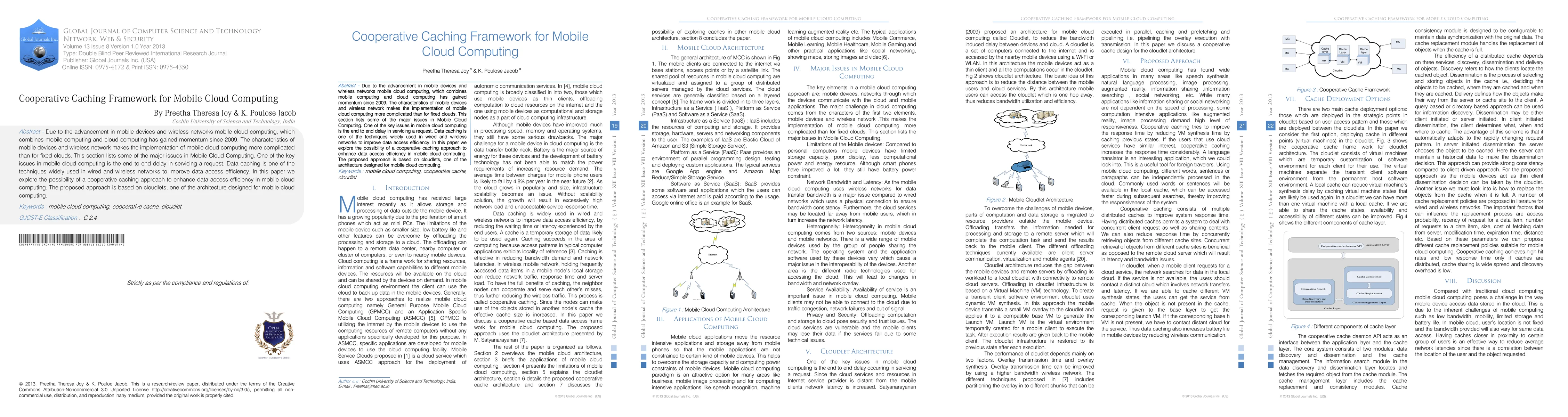 This paper proposes a cooperative caching framework for mobile cloud computing to enhance data access efficiency, leveraging cloudlets to address the complexities and delays inherent in mobile environments. The cooperative caching approach aims to optimize data retrieval by caching frequently accessed data across multiple nodes.