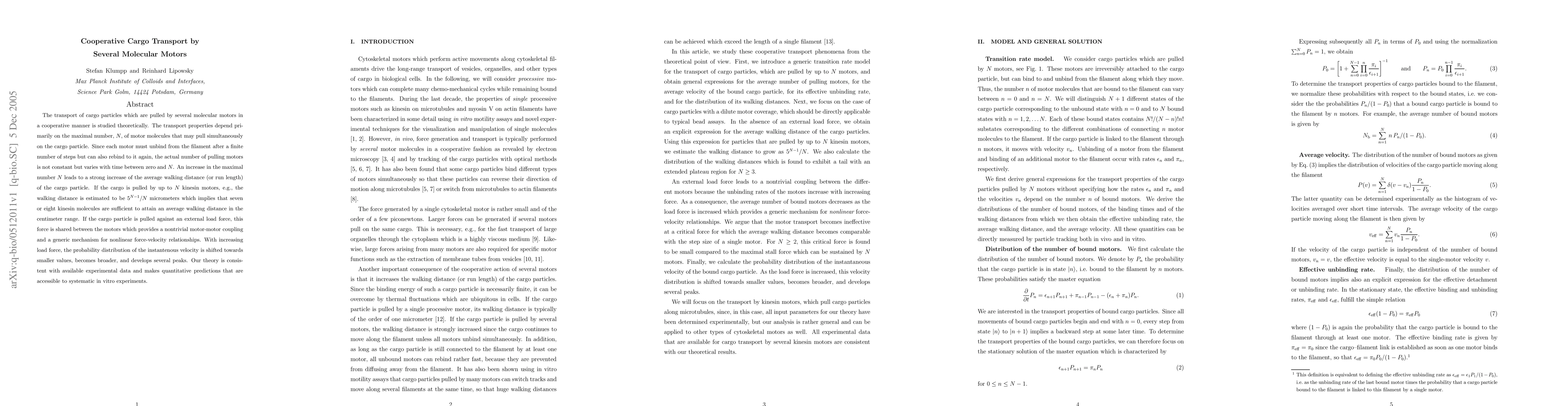 This paper theoretically explores cooperative cargo transport by multiple molecular motors, showing that the maximal number of motors, $N$, significantly increases the average walking distance of the cargo. The study also reveals how external load forces affect motor-motor coupling and the resulting nonlinear force-velocity relationships, with predictions consistent with experimental data.