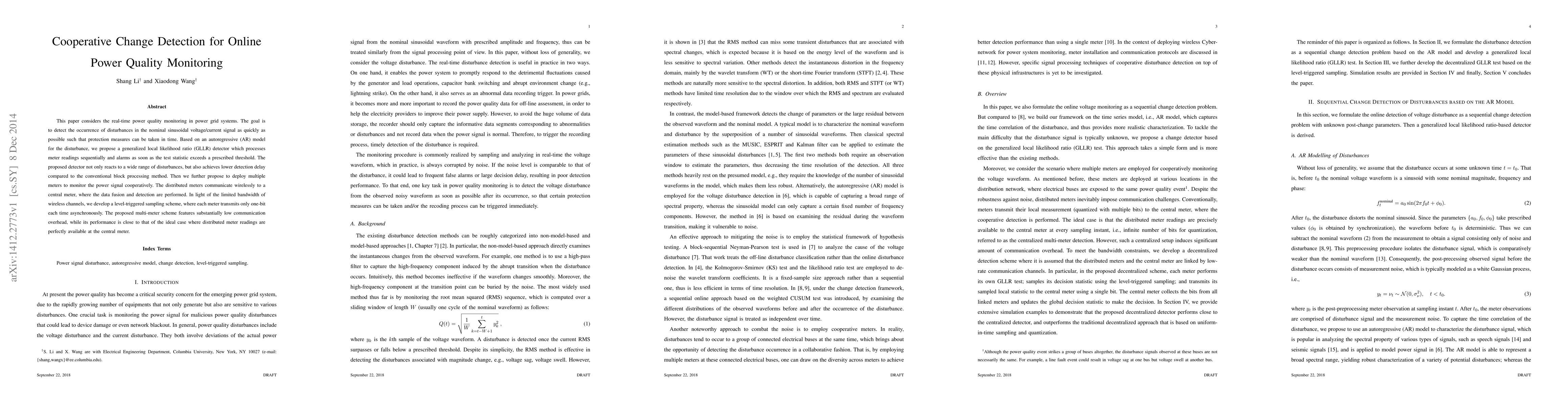 This paper considers the real-time power quality monitoring in power grid systems. The goal is to detect the occurrence of disturbances in the nominal sinusoidal voltage/current signal as quickly as possible such that protection measures can be taken in time. Based on an autoregressive (AR) model for the disturbance, we propose a generalized local likelihood ratio (GLLR) detector which processes meter readings sequentially and alarms as soon as the test statistic exceeds a prescribed threshold. The proposed detector not only reacts to a wide range of disturbances, but also achieves lower detection delay compared to the conventional block processing method. Then we further propose to deploy multiple meters to monitor the power signal cooperatively. The distributed meters communicate wirelessly to a central meter, where the data fusion and detection are performed. In light of the limited bandwidth of wireless channels, we develop a level-triggered sampling scheme, where each meter transmits only one-bit each time asynchronously. The proposed multi-meter scheme features substantially low communication overhead, while its performance is close to that of the ideal case where distributed meter readings are perfectly available at the central meter.