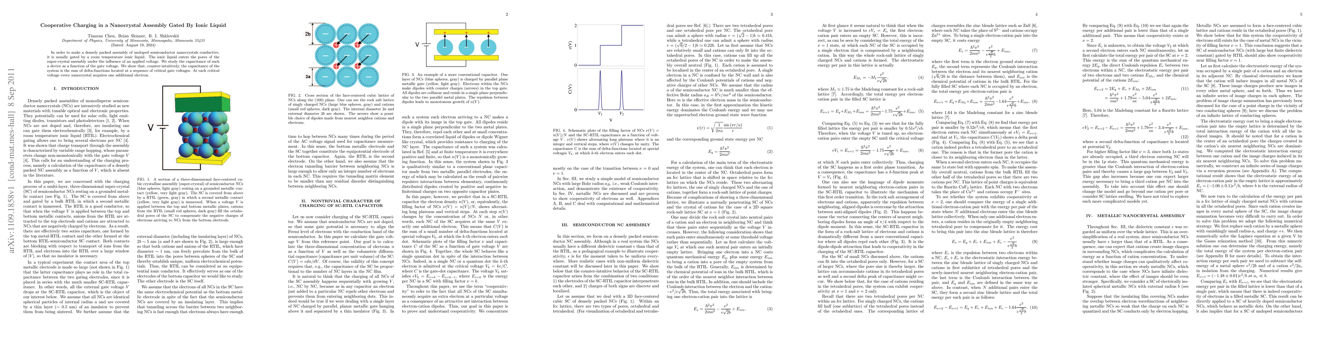 This paper investigates the conductive behavior of a densely packed semiconductor nanocrystal assembly gated by a room temperature ionic liquid, revealing that the system's capacitance exhibits a series of delta-function peaks at critical gate voltages, where each nanocrystal gains an additional electron. This cooperative charging mechanism is counter-intuitive and highlights unique electronic properties.