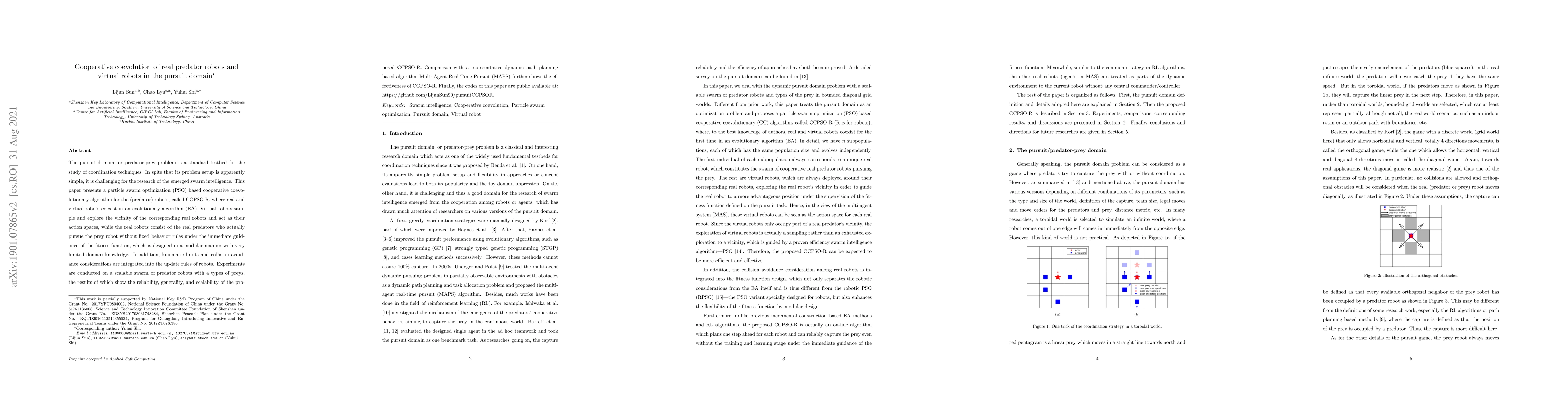 The pursuit domain, or predator-prey problem is a standard testbed for the study of coordination techniques. In spite that its problem setup is apparently simple, it is challenging for the research of the emerged swarm intelligence. This paper presents a particle swarm optimization (PSO) based cooperative coevolutionary algorithm for the (predator) robots, called CCPSO-R, where real and virtual robots coexist in an evolutionary algorithm (EA). Virtual robots sample and explore the vicinity of the corresponding real robots and act as their action spaces, while the real robots consist of the real predators who actually pursue the prey robot without fixed behavior rules under the immediate guidance of the fitness function, which is designed in a modular manner with very limited domain knowledge. In addition, kinematic limits and collision avoidance considerations are integrated into the update rules of robots. Experiments are conducted on a scalable swarm of predator robots with 4 types of preys, the results of which show the reliability, generality, and scalability of the proposed CCPSO-R. Comparison with a representative dynamic path planning based algorithm Multi-Agent Real-Time Pursuit (MAPS) further shows the effectiveness of CCPSO-R. Finally, the codes of this paper are public available at: https://github.com/LijunSun90/pursuitCCPSOR.