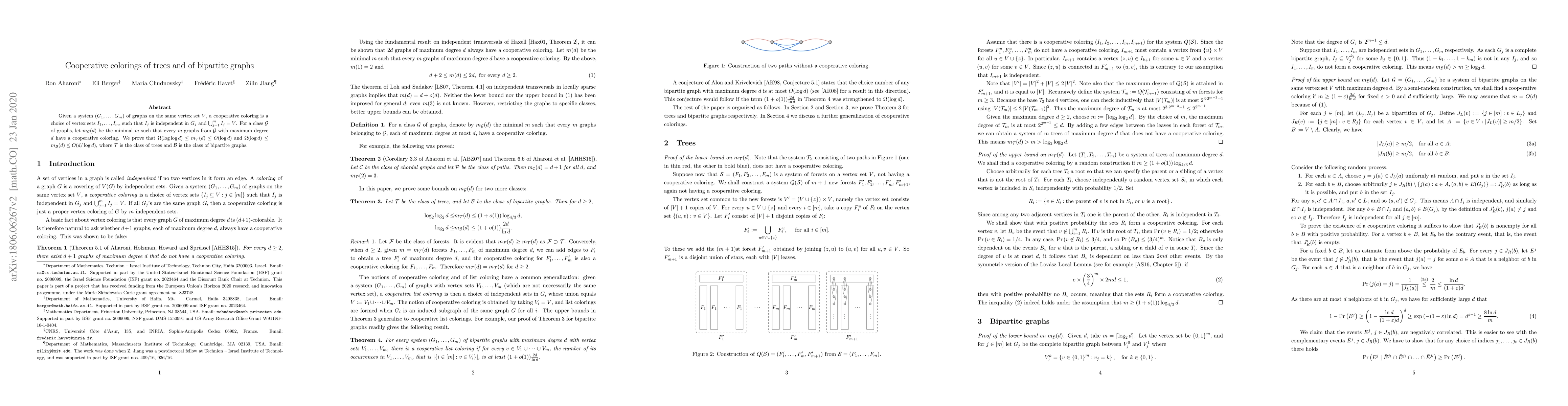 Given a system $(G_1, \ldots ,G_m)$ of graphs on the same vertex set $V$, a cooperative coloring is a choice of vertex sets $I_1, \ldots ,I_m$, such that $I_j$ is independent in $G_j$ and $\bigcup_{j=1}^{m}I_j = V$. For a class $\mathcal{G}$ of graphs, let $m_{\mathcal{G}}(d)$ be the minimal $m$ such that every $m$ graphs from $\mathcal{G}$ with maximum degree $d$ have a cooperative coloring. We prove that $\Omega(\log\log d) \le m_\mathcal{T}(d) \le O(\log d)$ and $\Omega(\log d)\le m_\mathcal{B}(d) \le O(d/\log d)$, where $\mathcal{T}$ is the class of trees and $\mathcal{B}$ is the class of bipartite graphs.