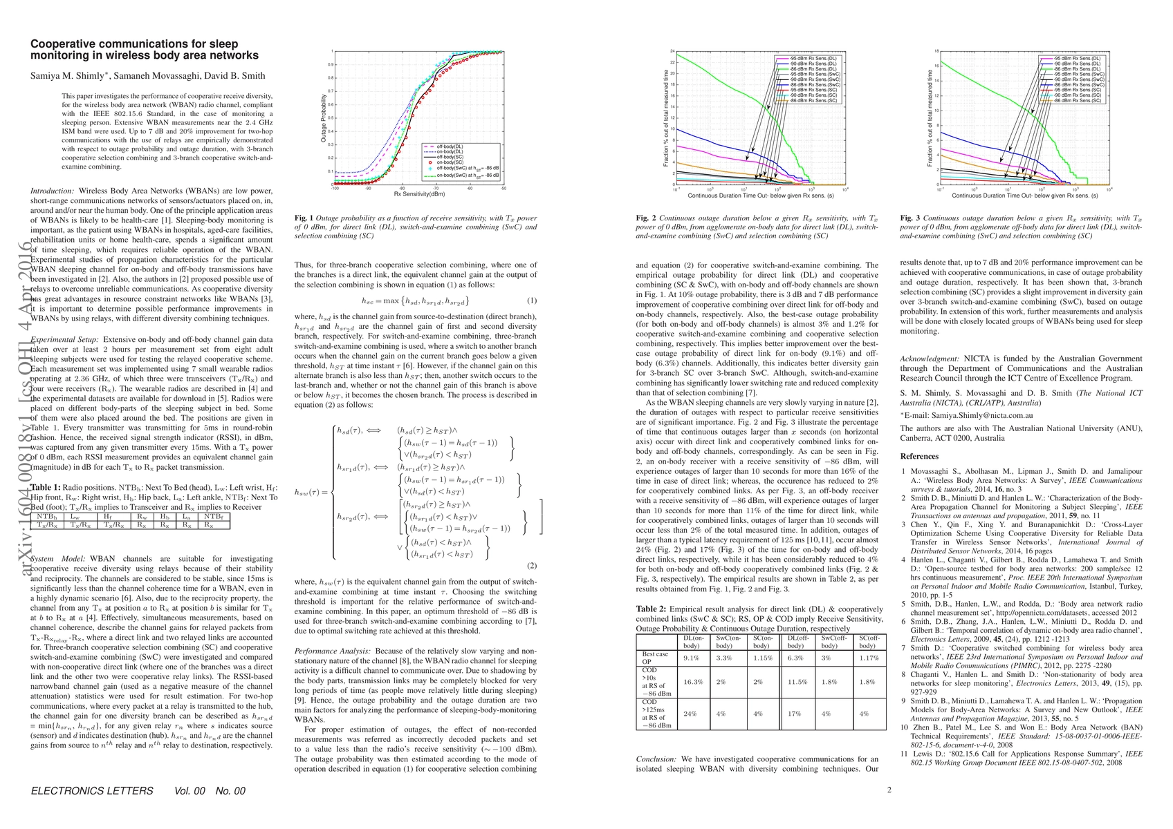 This paper evaluates cooperative receive diversity in wireless body area networks for sleep monitoring, showing up to 7 dB improvement and 20% reduction in outage probability and duration using relay-based two-hop communications. The study is based on extensive measurements near the 2.4 GHz ISM band.