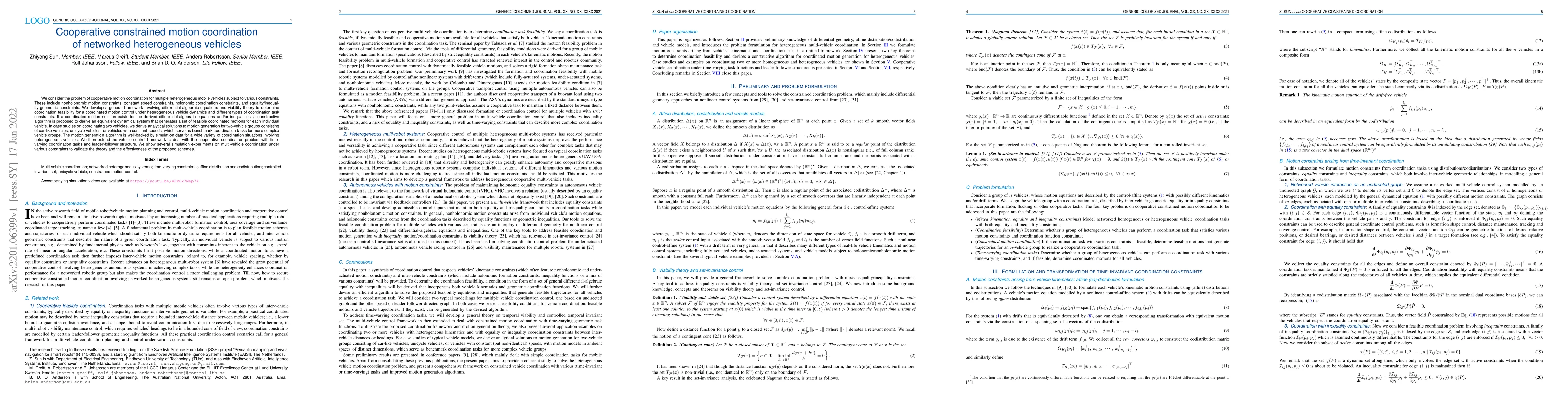 We consider the problem of cooperative motion coordination for multiple heterogeneous mobile vehicles subject to various constraints. These include nonholonomic motion constraints, constant speed constraints, holonomic coordination constraints, and equality/inequality geometric constraints. We develop a general framework involving differential-algebraic equations and viability theory to determine coordination feasibility for a coordinated motion control under heterogeneous vehicle dynamics and different types of coordination task constraints. If a coordinated motion solution exists for the derived differential-algebraic equations and/or inequalities, a constructive algorithm is proposed to derive an equivalent dynamical system that generates a set of feasible coordinated motions for each individual vehicle. In case studies on coordinating two vehicles, we derive analytical solutions to motion generation for two-vehicle groups consisting of car-like vehicles, unicycle vehicles, or vehicles with constant speeds, which serve as benchmark coordination tasks for more complex vehicle groups. The motion generation algorithm is well-backed by simulation data for a wide variety of coordination situations involving heterogeneous vehicles. We then extend the vehicle control framework to deal with the cooperative coordination problem with time-varying coordination tasks and leader-follower structure. We show several simulation experiments on multi-vehicle coordination under various constraints to validate the theory and the effectiveness of the proposed schemes.