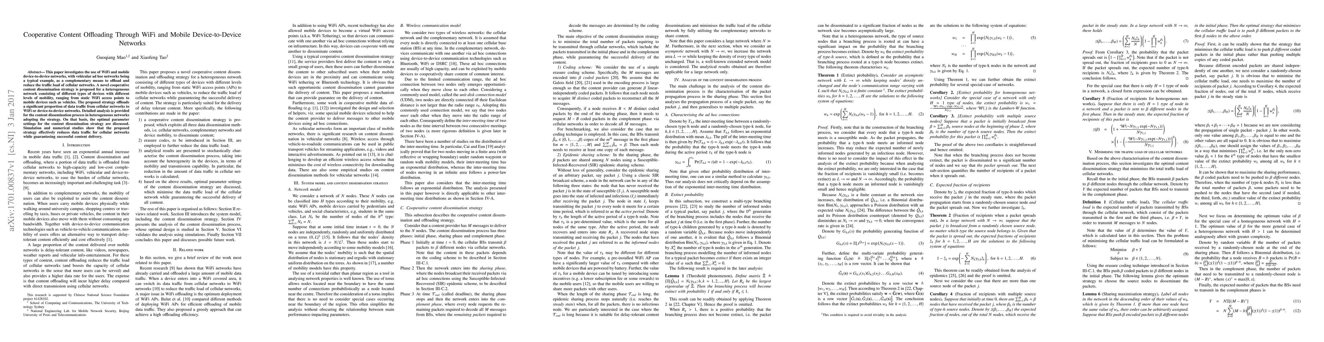 This paper proposes a cooperative content dissemination strategy to offload data traffic from cellular networks to WiFi and mobile device-to-device networks, significantly reducing cellular network load while ensuring successful content delivery, as demonstrated through simulations and numerical analysis.