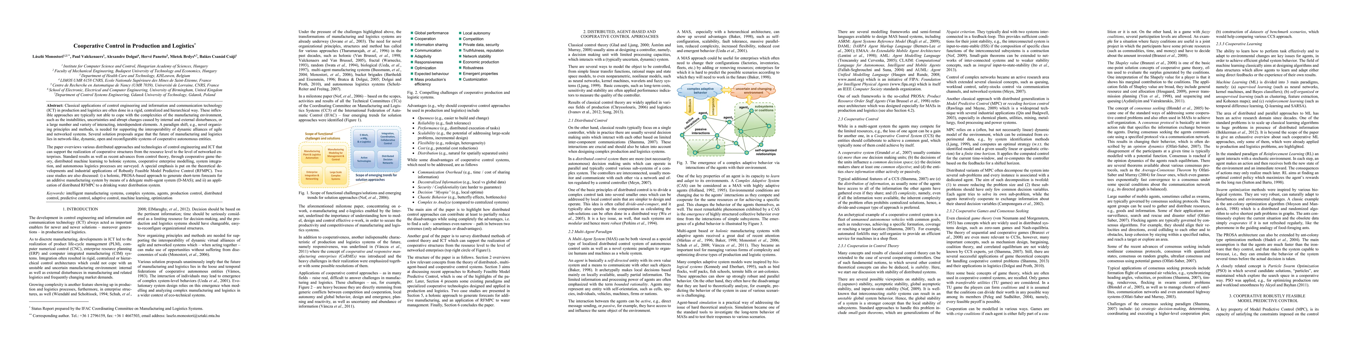 Classical applications of control engineering and information and communication technology (ICT) in production and logistics are often done in a rigid, centralized and hierarchical way. These inflexible approaches are typically not able to cope with the complexities of the manufacturing environment, such as the instabilities, uncertainties and abrupt changes caused by internal and external disturbances, or a large number and variety of interacting, interdependent elements. A paradigm shift, e.g., novel organizing principles and methods, is needed for supporting the interoperability of dynamic alliances of agile and networked systems. Several solution proposals argue that the future of manufacturing and logistics lies in network-like, dynamic, open and reconfigurable systems of cooperative autonomous entities. The paper overviews various distributed approaches and technologies of control engineering and ICT that can support the realization of cooperative structures from the resource level to the level of networked enterprises. Standard results as well as recent advances from control theory, through cooperative game theory, distributed machine learning to holonic systems, cooperative enterprise modelling, system integration, and autonomous logistics processes are surveyed. A special emphasis is put on the theoretical developments and industrial applications of Robustly Feasible Model Predictive Control (RFMPC). Two case studies are also discussed: i) a holonic, PROSA-based approach to generate short-term forecasts for an additive manufacturing system by means of a delegate multi-agent system (D-MAS); and ii) an application of distributed RFMPC to a drinking water distribution system.