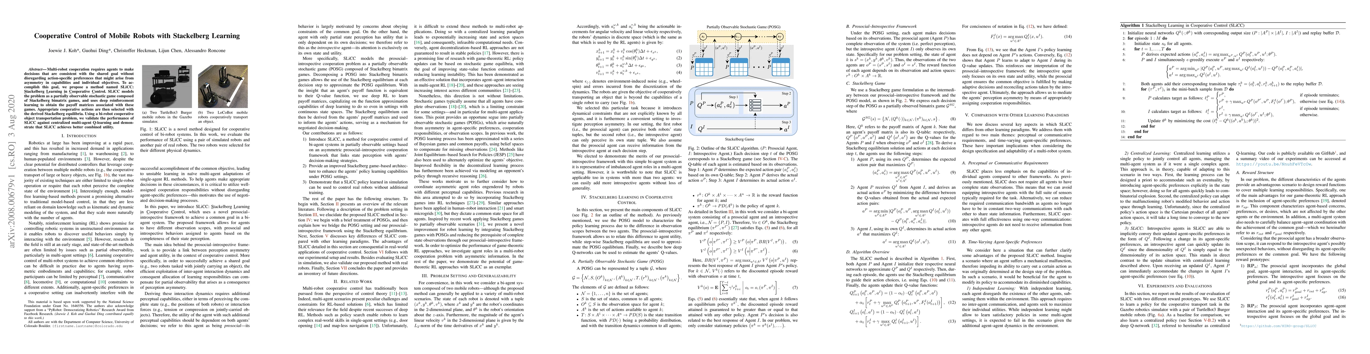 The paper proposes SLiCC, a method for cooperative control of mobile robots using Stackelberg Learning in Cooperative Control, which leverages deep reinforcement learning to determine optimal cooperative actions in a partially observable stochastic game. The method outperforms centralized multi-agent Q-learning in a bi-robot object transportation task, achieving better combined utility.