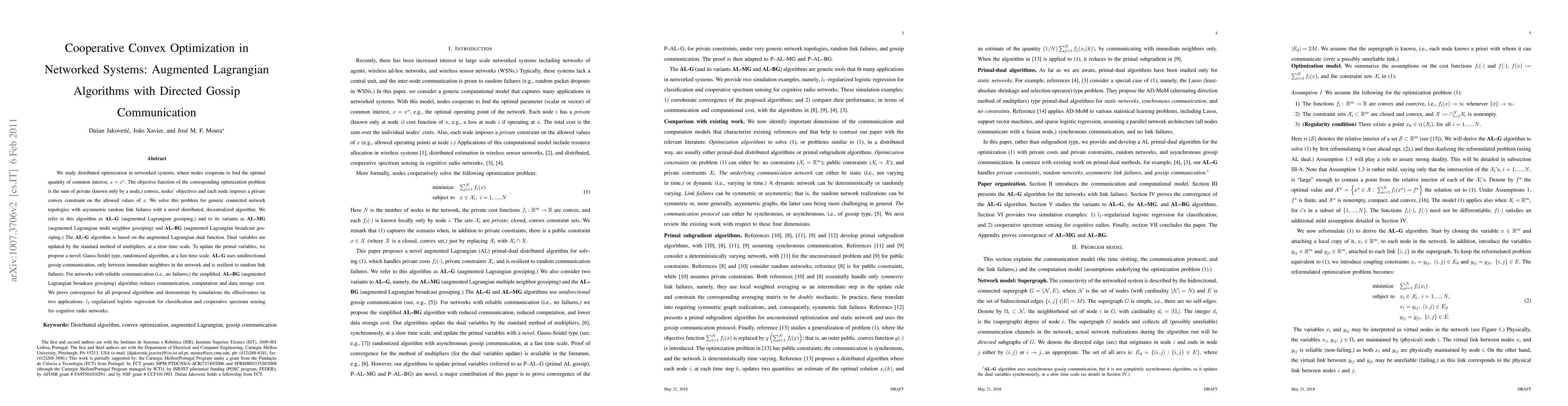 This paper proposes distributed, decentralized algorithms for cooperative convex optimization in networked systems, focusing on finding an optimal common quantity. The AL-G algorithm, along with its variants AL-MG and AL-BG, leverages augmented Lagrangian methods and unidirectional gossip communication to handle asymmetric link failures and optimize under network constraints. The algorithms are shown to converge and are effective in applications like l_1-regularized logistic regression and cooperative spectrum sensing.