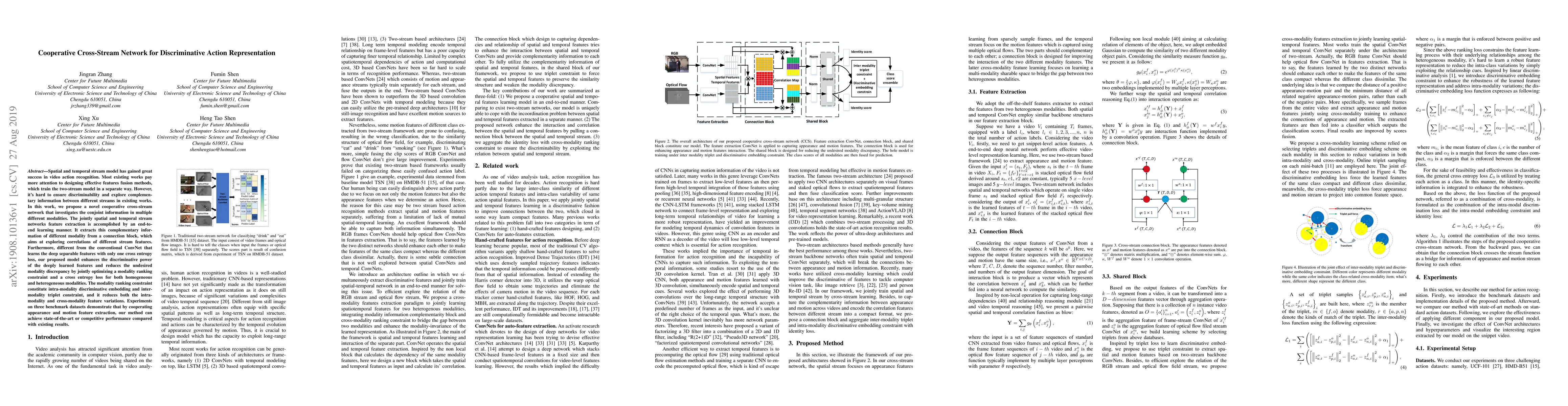 Spatial and temporal stream model has gained great success in video action recognition. Most existing works pay more attention to designing effective features fusion methods, which train the two-stream model in a separate way. However, it's hard to ensure discriminability and explore complementary information between different streams in existing works. In this work, we propose a novel cooperative cross-stream network that investigates the conjoint information in multiple different modalities. The jointly spatial and temporal stream networks feature extraction is accomplished by an end-to-end learning manner. It extracts this complementary information of different modality from a connection block, which aims at exploring correlations of different stream features. Furthermore, different from the conventional ConvNet that learns the deep separable features with only one cross-entropy loss, our proposed model enhances the discriminative power of the deeply learned features and reduces the undesired modality discrepancy by jointly optimizing a modality ranking constraint and a cross-entropy loss for both homogeneous and heterogeneous modalities. The modality ranking constraint constitutes intra-modality discriminative embedding and inter-modality triplet constraint, and it reduces both the intra-modality and cross-modality feature variations. Experiments on three benchmark datasets demonstrate that by cooperating appearance and motion feature extraction, our method can achieve state-of-the-art or competitive performance compared with existing results.
