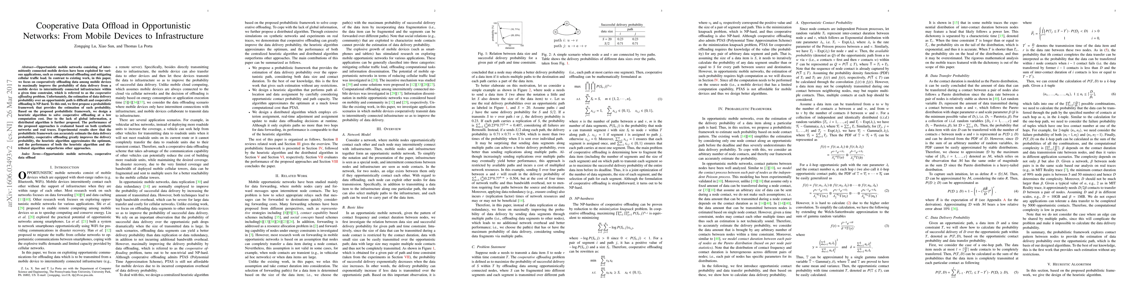 This paper proposes a probabilistic framework and heuristic algorithms to enhance data delivery in opportunistic mobile networks by cooperatively offloading data among mobile devices to intermittently connected infrastructure. The proposed methods improve delivery probability and outperform existing approaches, as demonstrated through synthetic and real-world network evaluations.