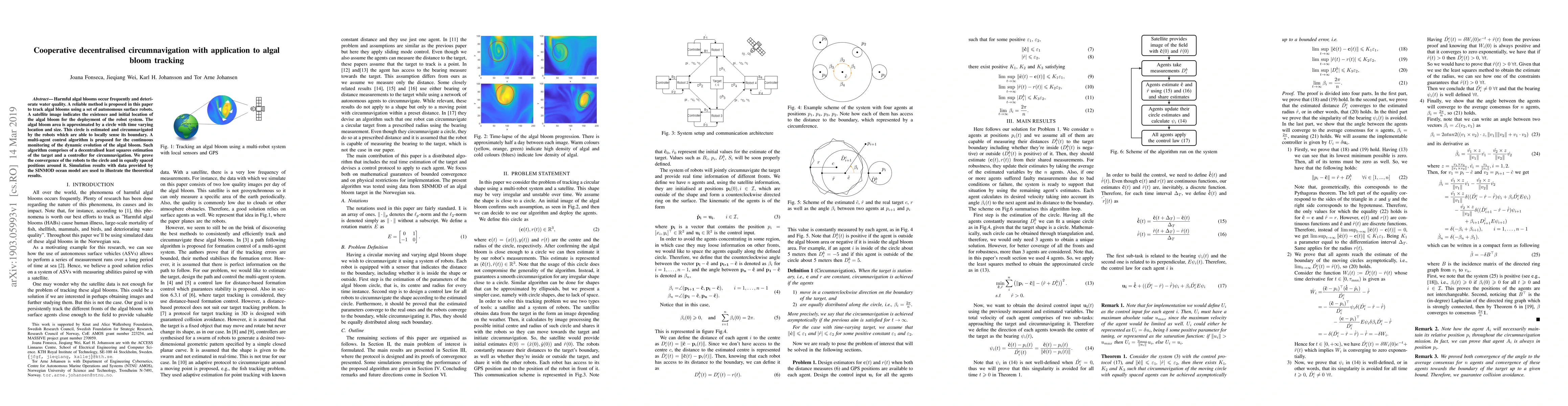 Harmful algal blooms occur frequently and deteriorate water quality. A reliable method is proposed in this paper to track algal blooms using a set of autonomous surface robots. A satellite image indicates the existence and initial location of the algal bloom for the deployment of the robot system. The algal bloom area is approximated by a circle with time varying location and size. This circle is estimated and circumnavigated by the robots which are able to locally sense its boundary. A multi-agent control algorithm is proposed for the continuous monitoring of the dynamic evolution of the algal bloom. Such algorithm comprises of a decentralized least squares estimation of the target and a controller for circumnavigation. We prove the convergence of the robots to the circle and in equally spaced positions around it. Simulation results with data provided by the SINMOD ocean model are used to illustrate the theoretical results.