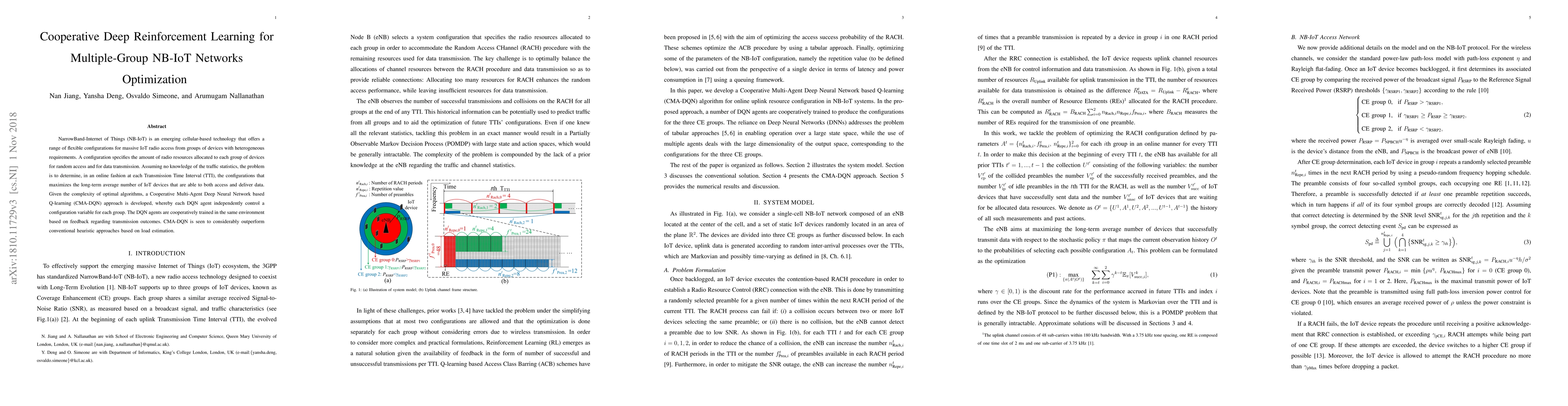 This paper introduces a new approach to optimizing NB-IoT networks for multiple groups of devices with different requirements. A cooperative deep reinforcement learning method outperforms traditional heuristic approaches in maximizing the long-term average number of IoT devices that can access and deliver data.