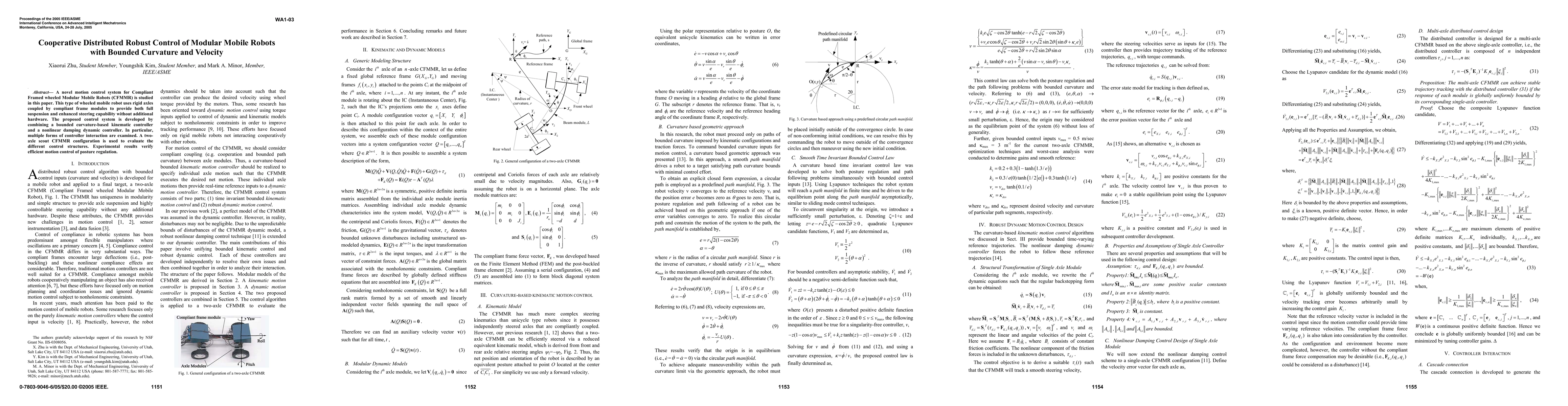 A novel motion control system for Compliant Framed wheeled Modular Mobile Robots (CFMMR) is studied in this paper. This type of wheeled mobile robot uses rigid axles coupled by compliant frame modules to provide both full suspension and enhanced steering capability without additional hardware. The proposed control system is developed by combining a bounded curvature-based kinematic controller and a nonlinear damping dynamic controller. In particular, multiple forms of controller interaction are examined. A twoaxle scout CFMMR configuration is used to evaluate the different control structures. Experimental results verify efficient motion control of posture regulation.