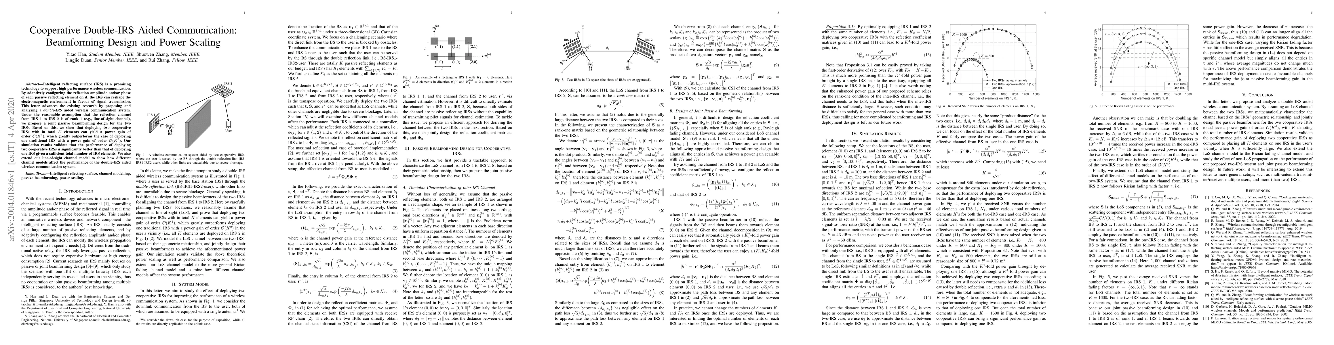 This paper proposes a cooperative double-IRS aided communication system, demonstrating a joint passive beamforming design that achieves a power gain of O(K^4) compared to a single IRS with O(K^2), under a line-of-sight reflection channel assumption. Simulation results show significant performance improvements with the double-IRS setup.