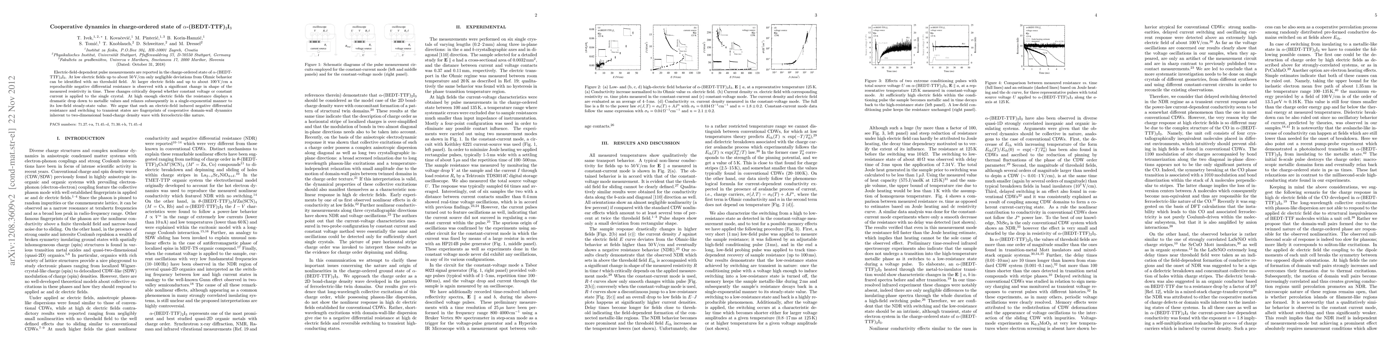 This paper investigates electric-field-induced dynamics in the charge-ordered state of alpha-(BEDT-TTF)2I3, revealing a negative differential resistance and cooperative domain-wall dynamics, suggesting ferroelectric-like behavior in the material's two-dimensional charge density wave. The resistance transitions to metallic values under high electric fields and relaxes exponentially, indicating complex cooperative interactions.