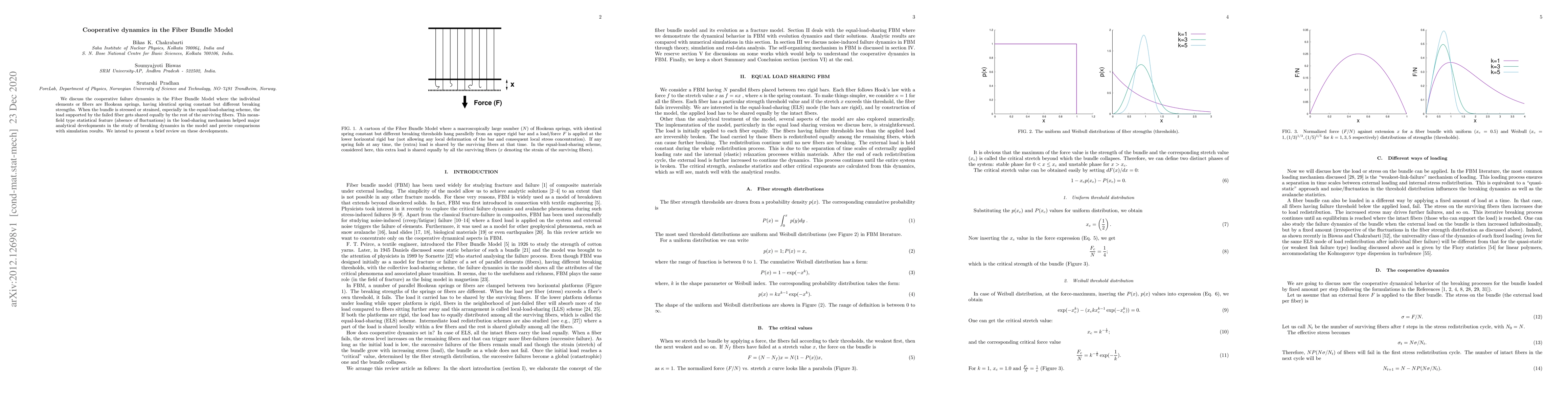 This paper reviews cooperative failure dynamics in the Fiber Bundle Model, where Hookean springs with varying breaking strengths share load equally upon failure. The mean-field statistical feature aids in analytical advancements and accurate simulations of breaking dynamics.