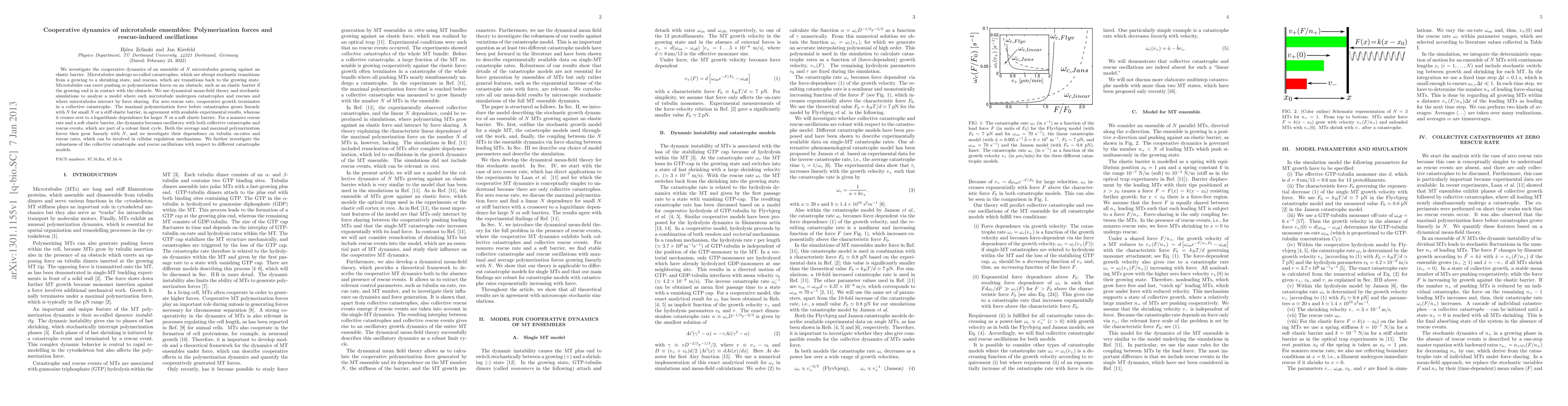 This paper examines the cooperative dynamics of microtubule ensembles growing against an elastic barrier, focusing on the interplay between catastrophes and rescues. It finds that the maximal polymerization force scales linearly with the number of microtubules for small numbers or stiff barriers, but logarithmically for larger numbers or softer barriers. With rescues, the system exhibits oscillatory dynamics forming a robust limit cycle, where both average and maximal polymerization forces scale linearly with the number of microtubules.