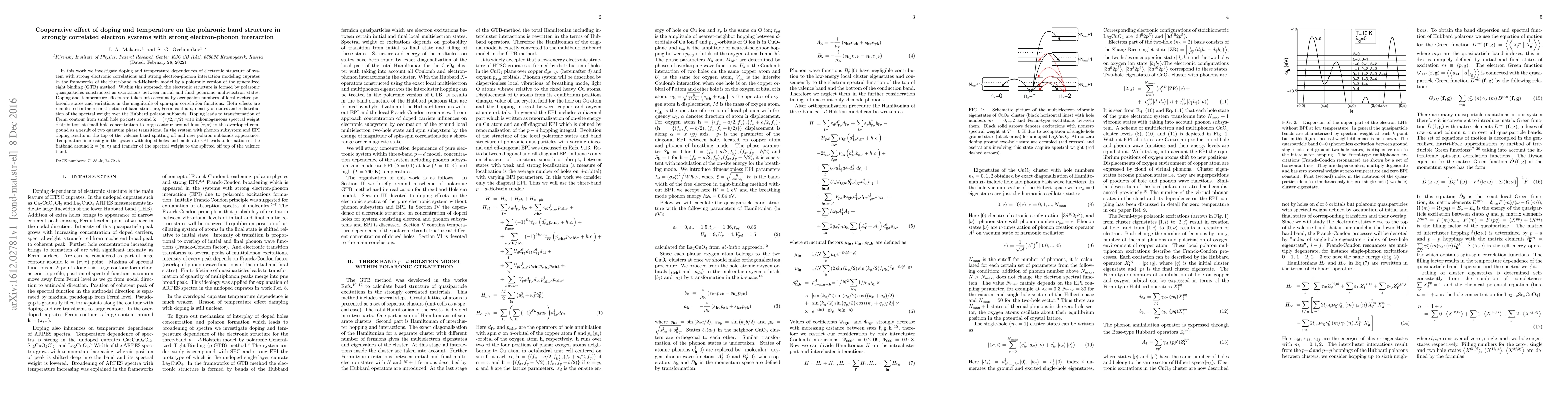 This paper explores the impact of doping and temperature on the electronic structure of strongly correlated electron systems with strong electron-phonon interaction, modeled using a three-band p-d-Holstein model. It reveals that doping induces quantum phase transitions and reconstructs the band structure, while temperature affects the spectral weight redistribution, leading to the formation of a flatband and new polaronic subbands.