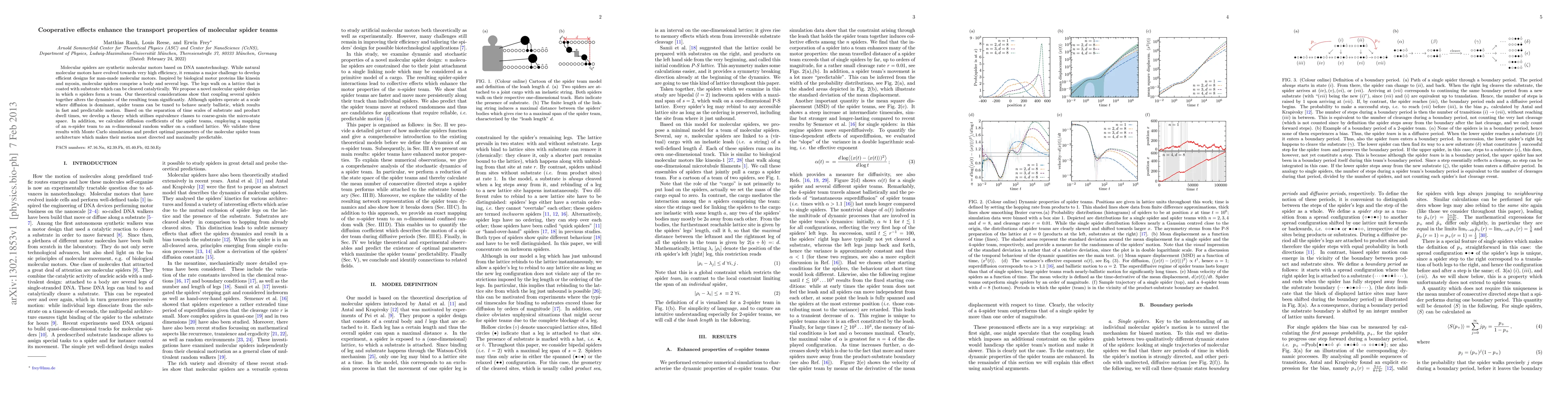Molecular spiders are synthetic molecular motors based on DNA nanotechnology. While natural molecular motors have evolved towards very high efficiency, it remains a major challenge to develop efficient designs for man-made molecular motors. Inspired by biological motor proteins like kinesin and myosin, molecular spiders comprise a body and several legs. The legs walk on a lattice that is coated with substrate which can be cleaved catalytically. We propose a novel molecular spider design in which n spiders form a team. Our theoretical considerations show that coupling several spiders together alters the dynamics of the resulting team significantly. Although spiders operate at a scale where diffusion is dominant, spider teams can be tuned to behave nearly ballistic, which results in fast and predictable motion. Based on the separation of time scales of substrate and product dwell times, we develop a theory which utilises equivalence classes to coarse-grain the micro-state space. In addition, we calculate diffusion coefficients of the spider teams, employing a mapping of an n-spider team to an n-dimensional random walker on a confined lattice. We validate these results with Monte Carlo simulations and predict optimal parameters of the molecular spider team architecture which makes their motion most directed and maximally predictable.