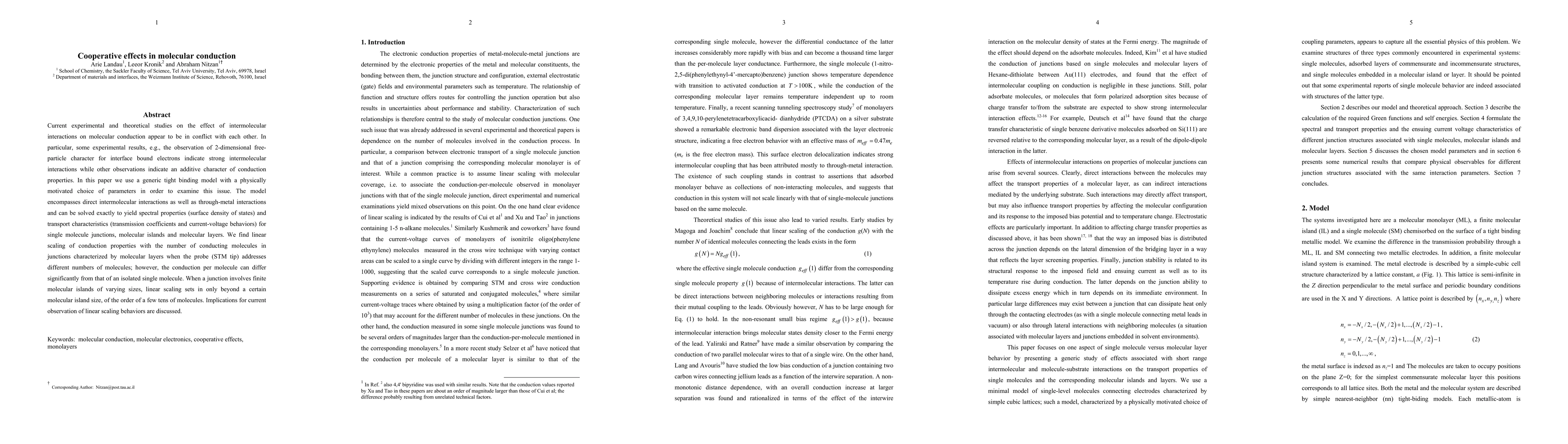 This paper investigates the conflicting experimental and theoretical views on intermolecular interactions in molecular conduction using a tight binding model. It finds linear scaling of conduction properties with the number of molecules in molecular layers, but significant differences in conduction per molecule compared to isolated molecules, with linear scaling emerging only for larger molecular islands.