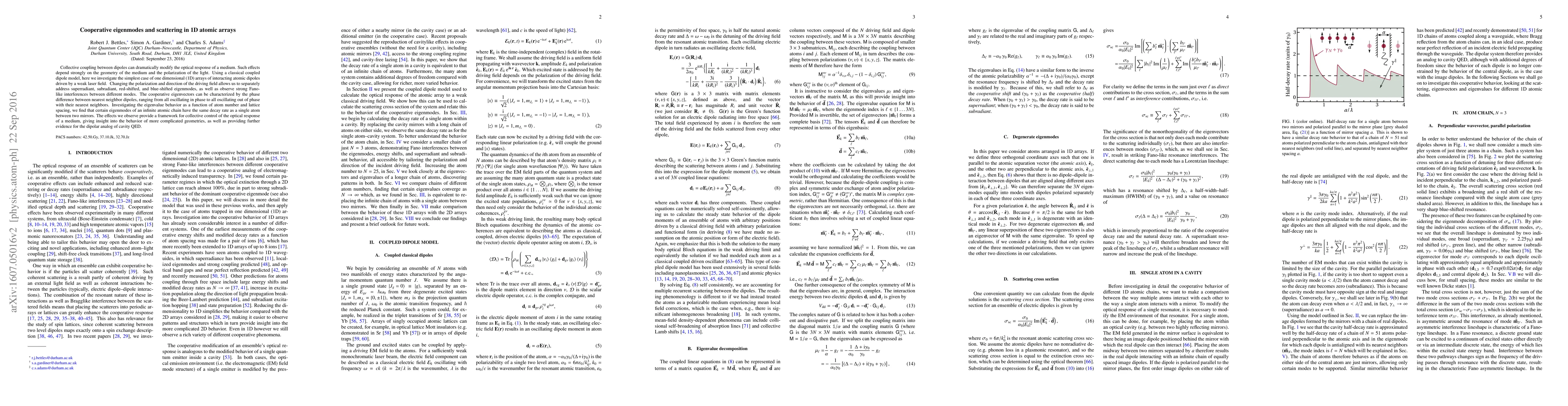 This paper explores the optical response of 1D atomic arrays using a classical coupled dipole model, revealing distinct cooperative eigenmodes and scattering effects influenced by the polarization and direction of a weak laser field. The study identifies superradiant, subradiant, and redshift/blueshift eigenmodes, providing insights into collective control and the dipolar analog of cavity QED.