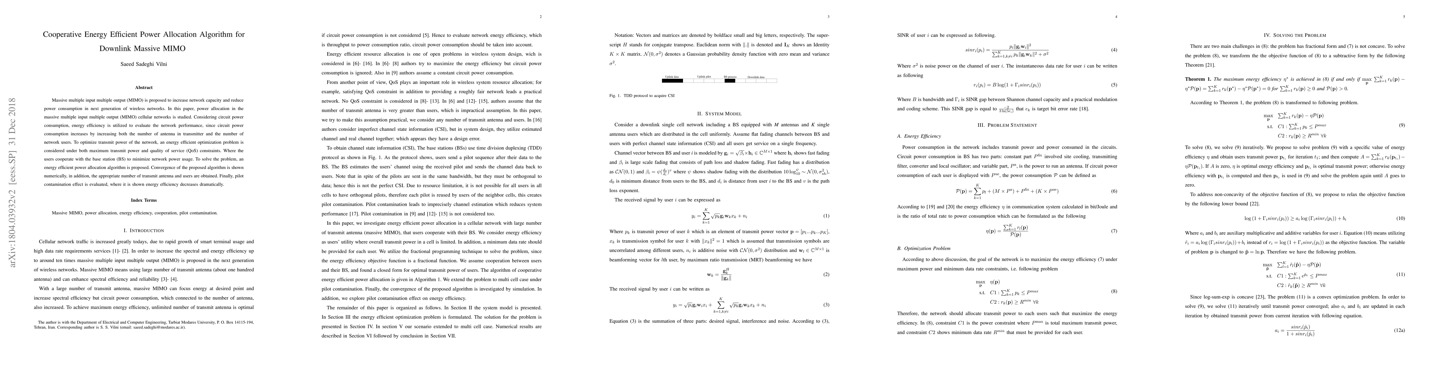 This paper proposes an energy efficient power allocation algorithm for a downlink massive MIMO system in cellular networks, optimizing for energy efficiency while considering circuit power consumption and quality of service constraints. The algorithm's convergence and effectiveness were demonstrated numerically, highlighting the impact of pilot contamination on energy efficiency.