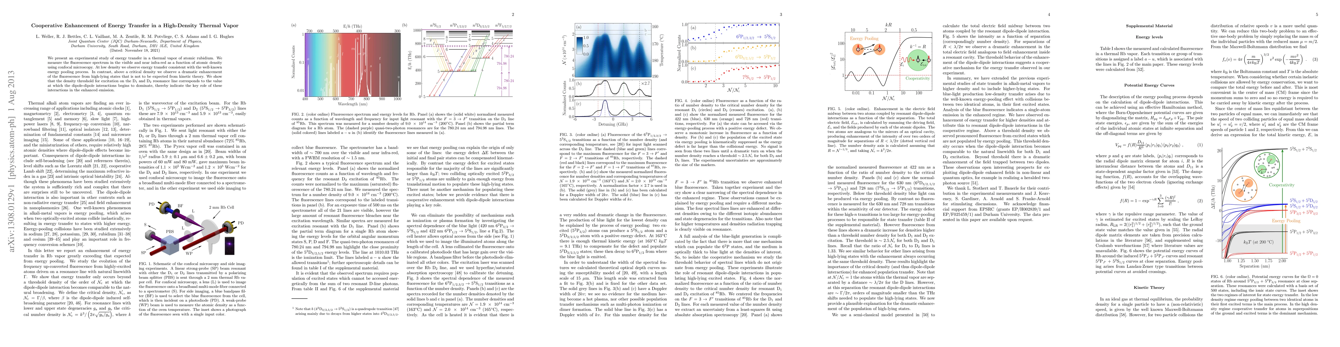 This study experimentally investigates energy transfer in a high-density thermal vapor of rubidium, revealing a significant enhancement in fluorescence above a critical density due to dominant dipole-dipole interactions, contrasting with the expected energy pooling process at low density.