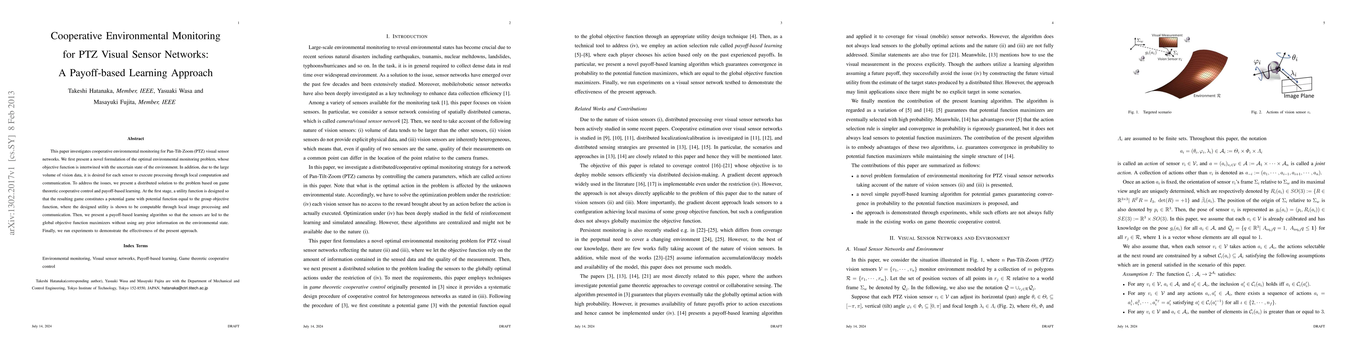 This paper proposes a cooperative control strategy for Pan-Tilt-Zoom (PTZ) visual sensor networks using a payoff-based learning approach to optimize environmental monitoring, leveraging local computation and communication to handle large vision data. Experiments validate the effectiveness of the proposed distributed solution.