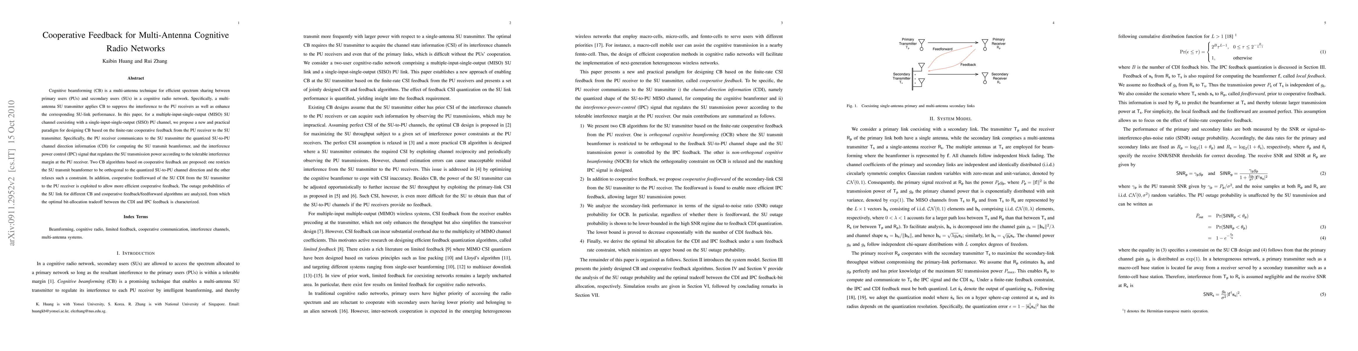 This paper proposes a new cooperative feedback paradigm for cognitive beamforming in multi-antenna cognitive radio networks, where the PU receiver provides quantized channel and interference power control information to the SU transmitter. Two beamforming algorithms are introduced, analyzing their outage probabilities to determine optimal feedback bit allocation.