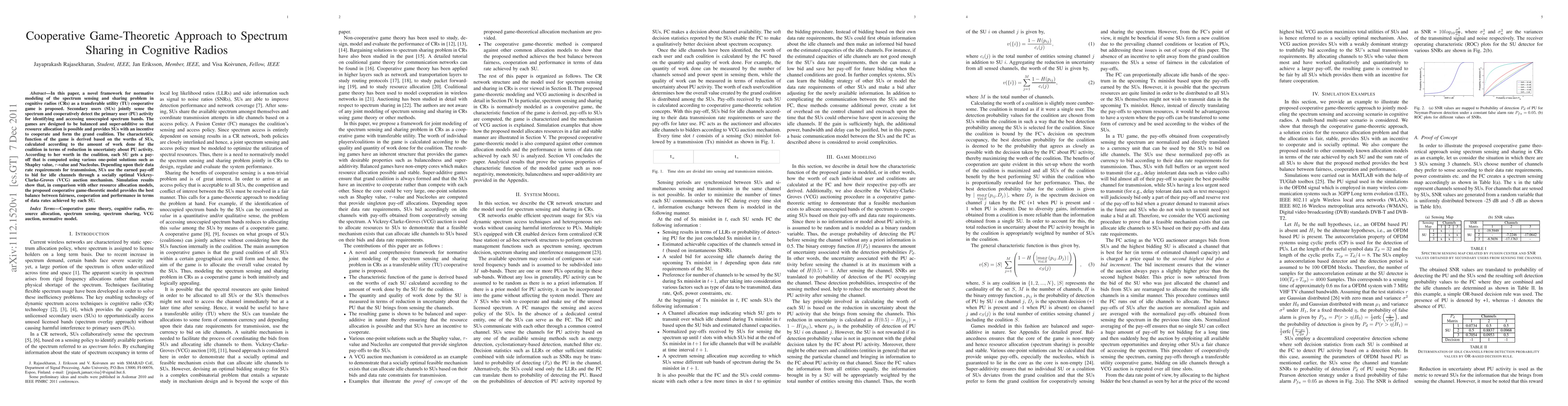 This paper proposes a cooperative game-theoretic framework for spectrum sharing in cognitive radios, where secondary users jointly sense and share spectrum through a transferable utility cooperative game. The model incentivizes cooperation and optimizes resource allocation via a VCG auction mechanism, achieving a balanced trade-off between fairness, cooperation, and data rates.