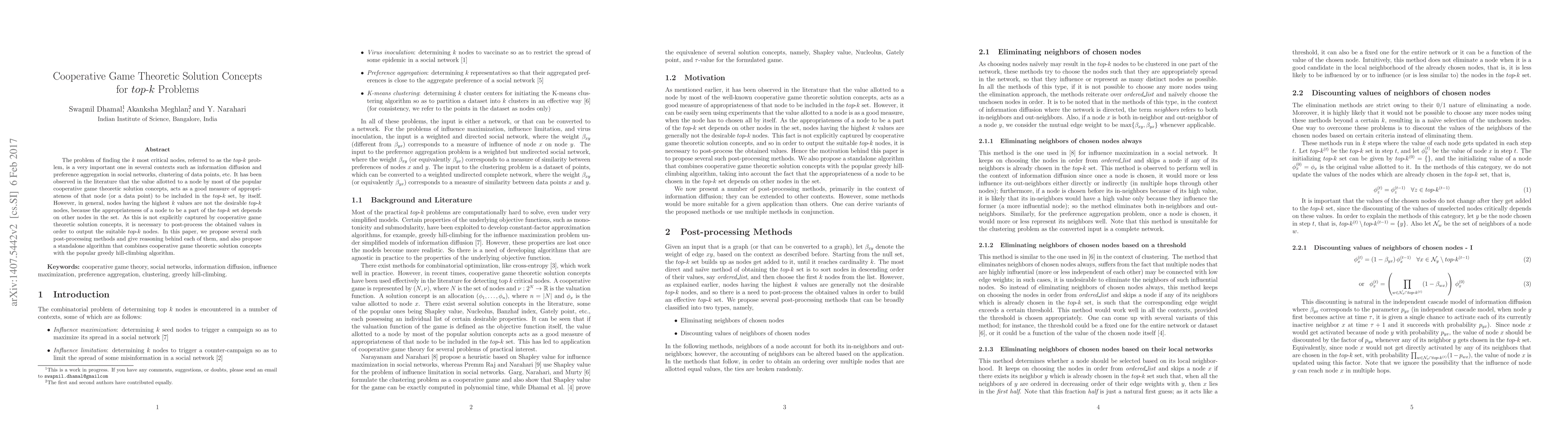 This paper addresses the top-$k$ problem in various applications, proposing post-processing methods to refine cooperative game theoretic solution concepts for identifying the most critical $k$ nodes. It also introduces a hybrid algorithm combining these concepts with a greedy hill-climbing approach for improved results.