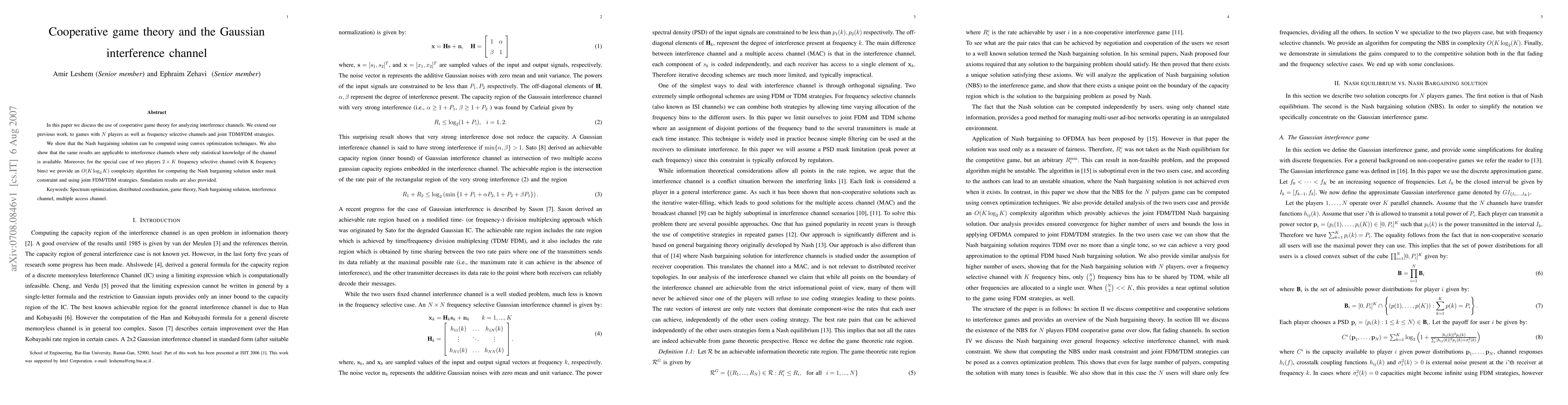 This paper applies cooperative game theory to analyze the Gaussian interference channel, extending previous work to N players and frequency selective channels. The Nash bargaining solution is computed via convex optimization, and an efficient algorithm is provided for a two-player scenario with $O(K \log_2 K)$ complexity for joint TDM/FDM strategies.