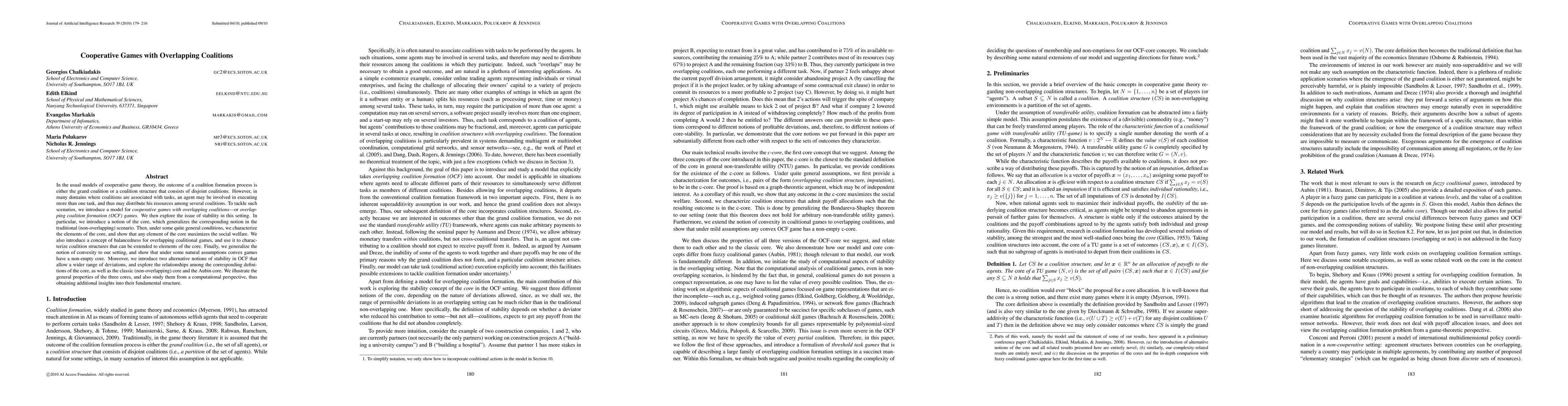 This paper introduces a model for cooperative games with overlapping coalitions, addressing scenarios where agents can participate in multiple tasks. It explores the stability of such games, defining a generalized core and characterizing its elements, which maximize social welfare. The paper also discusses balancedness, convexity, and alternative notions of stability, comparing them to traditional and Aubin cores, and provides computational insights into these concepts.