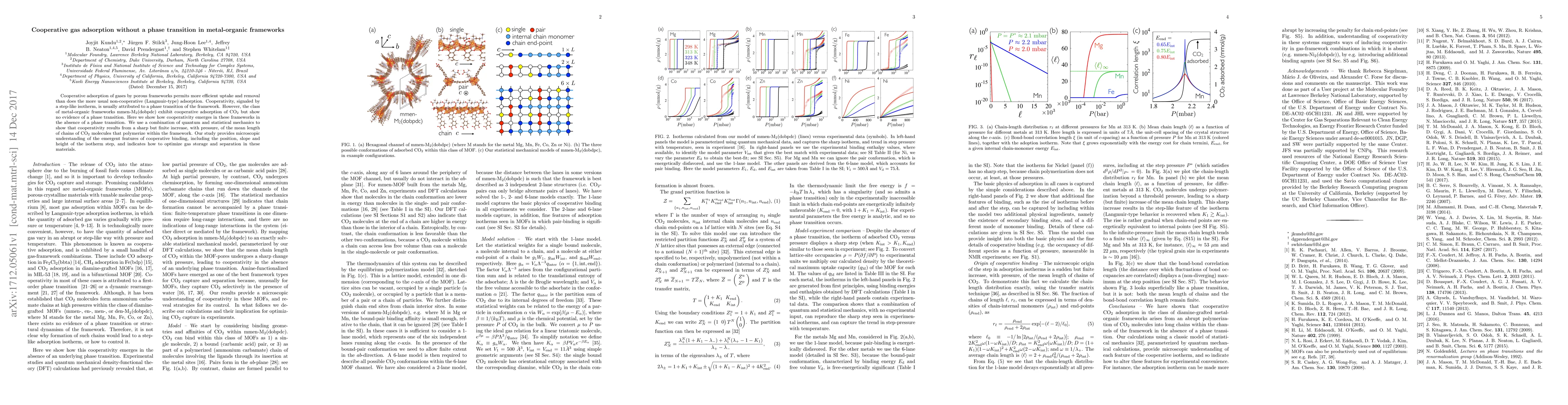 This paper demonstrates cooperative gas adsorption in metal-organic frameworks (mmen-M$_2$(dobpdc)) without a phase transition, revealing that cooperativity arises from a pressure-induced increase in CO2 polymer chain length. The study combines quantum and statistical mechanics to provide insights into optimizing gas storage and separation in these materials.