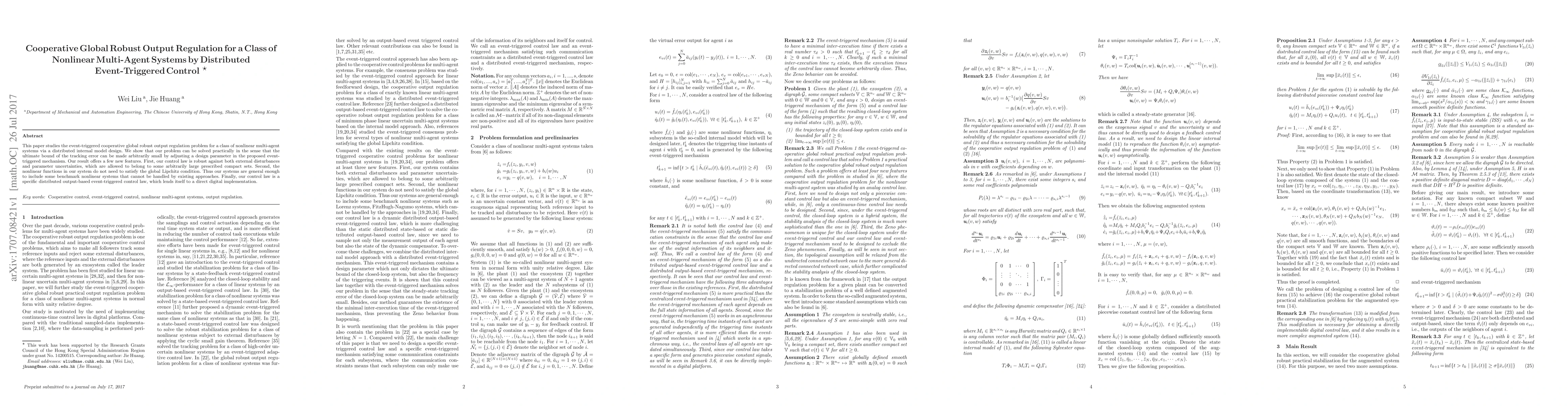 This paper studies the event-triggered cooperative global robust output regulation problem for a class of nonlinear multi-agent systems via a distributed internal model design. We show that our problem can be solved practically in the sense that the ultimate bound of the tracking error can be made arbitrarily small by adjusting a design parameter in the proposed event-triggered mechanism. Our result offers a few new features. First, our control law is robust against both external disturbances and parameter uncertainties, which are allowed to belong to some arbitrarily large prescribed compact sets. Second, the nonlinear functions in our system do not need to satisfy the global Lipchitz condition. Thus our systems are general enough to include some benchmark nonlinear systems that cannot be handled by existing approaches. Finally, our control law is a specific distributed output-based event-triggered control law, which lends itself to a direct digital implementation.
