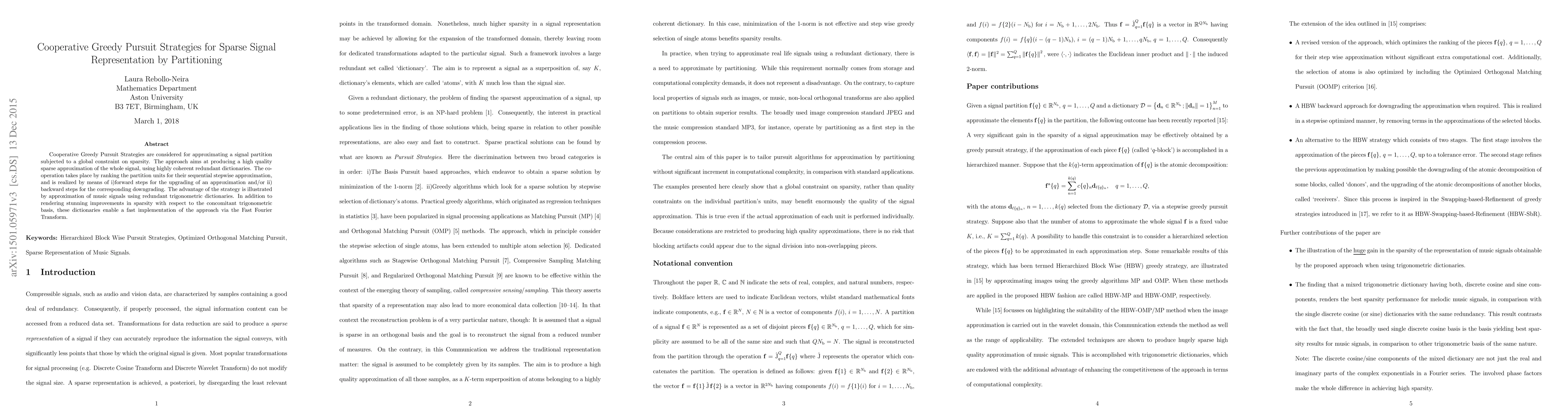 This paper proposes cooperative greedy pursuit strategies for sparse signal representation by partitioning, utilizing redundant dictionaries to achieve high-quality approximations under global sparsity constraints. The method employs forward and backward steps for sequential approximation, demonstrating significant improvements in sparsity and computational efficiency for music signals using trigonometric dictionaries.