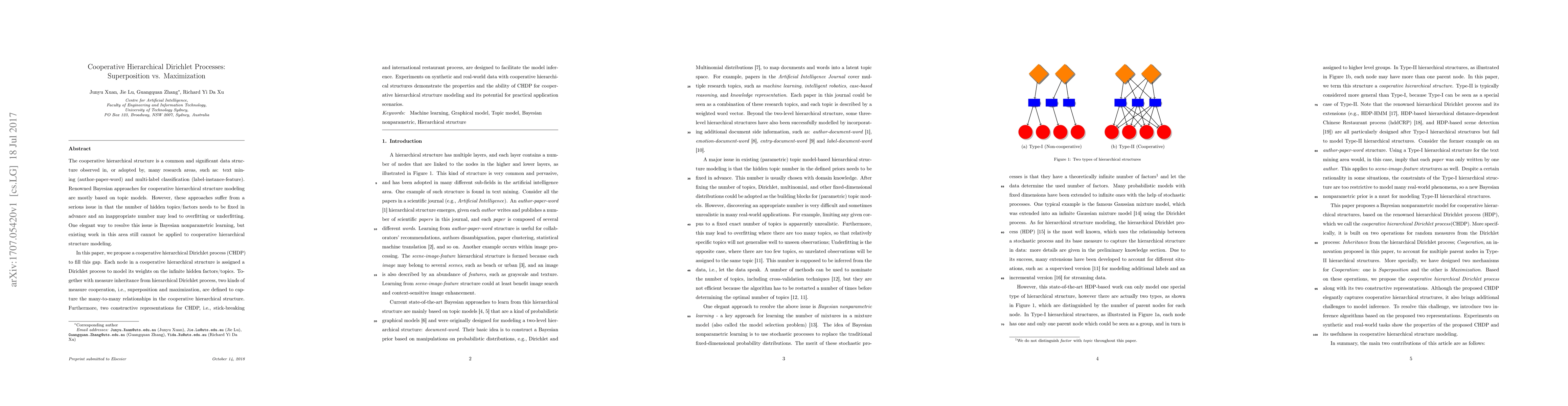 This paper introduces a cooperative hierarchical Dirichlet process (CHDP) to model complex hierarchical data structures without pre-defining the number of hidden topics, addressing overfitting or underfitting issues. It proposes two cooperation methods, superposition and maximization, to capture many-to-many relationships and demonstrates the model's effectiveness through experiments on synthetic and real-world datasets.