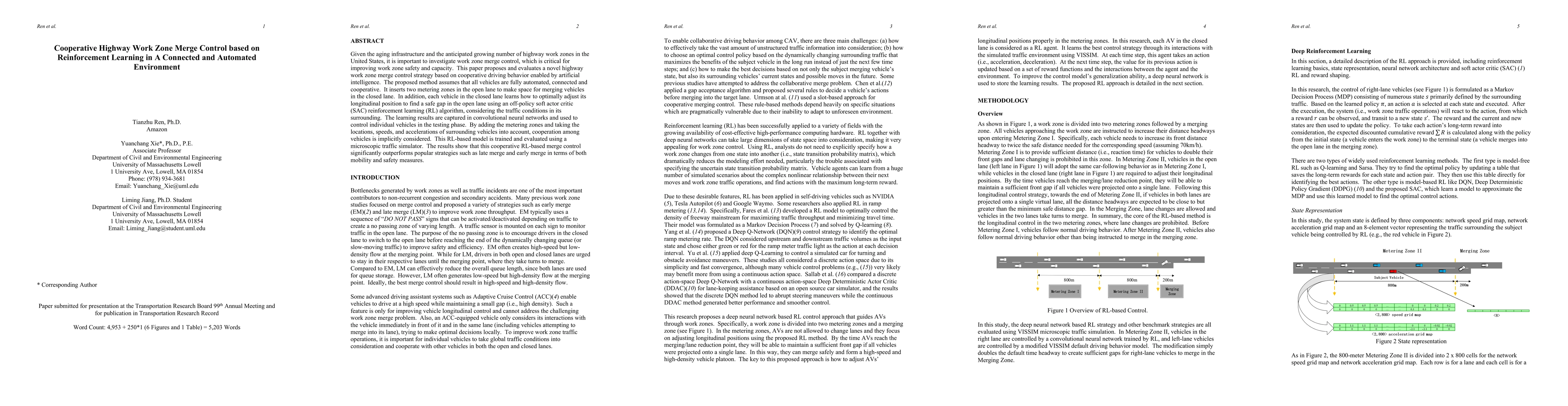 This paper proposes a cooperative highway work zone merge control strategy using reinforcement learning in a fully automated, connected environment. The method introduces metering zones to facilitate merging, with vehicles learning optimal merging strategies via an off-policy soft actor critic algorithm, significantly improving both mobility and safety compared to traditional merge strategies.