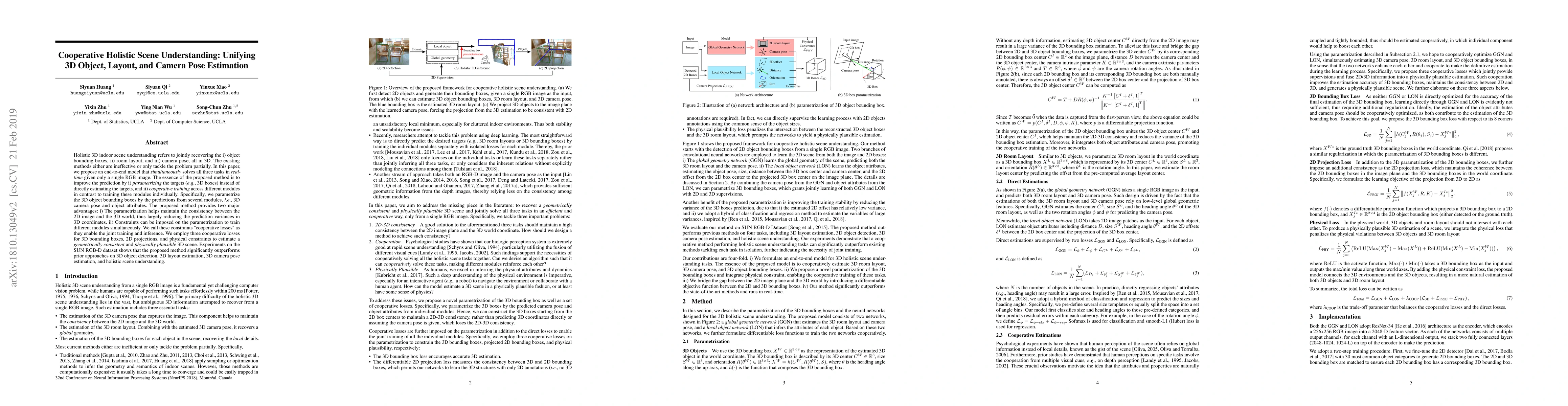 Holistic 3D indoor scene understanding refers to jointly recovering the i) object bounding boxes, ii) room layout, and iii) camera pose, all in 3D. The existing methods either are ineffective or only tackle the problem partially. In this paper, we propose an end-to-end model that simultaneously solves all three tasks in real-time given only a single RGB image. The essence of the proposed method is to improve the prediction by i) parametrizing the targets (e.g., 3D boxes) instead of directly estimating the targets, and ii) cooperative training across different modules in contrast to training these modules individually. Specifically, we parametrize the 3D object bounding boxes by the predictions from several modules, i.e., 3D camera pose and object attributes. The proposed method provides two major advantages: i) The parametrization helps maintain the consistency between the 2D image and the 3D world, thus largely reducing the prediction variances in 3D coordinates. ii) Constraints can be imposed on the parametrization to train different modules simultaneously. We call these constraints "cooperative losses" as they enable the joint training and inference. We employ three cooperative losses for 3D bounding boxes, 2D projections, and physical constraints to estimate a geometrically consistent and physically plausible 3D scene. Experiments on the SUN RGB-D dataset shows that the proposed method significantly outperforms prior approaches on 3D object detection, 3D layout estimation, 3D camera pose estimation, and holistic scene understanding.