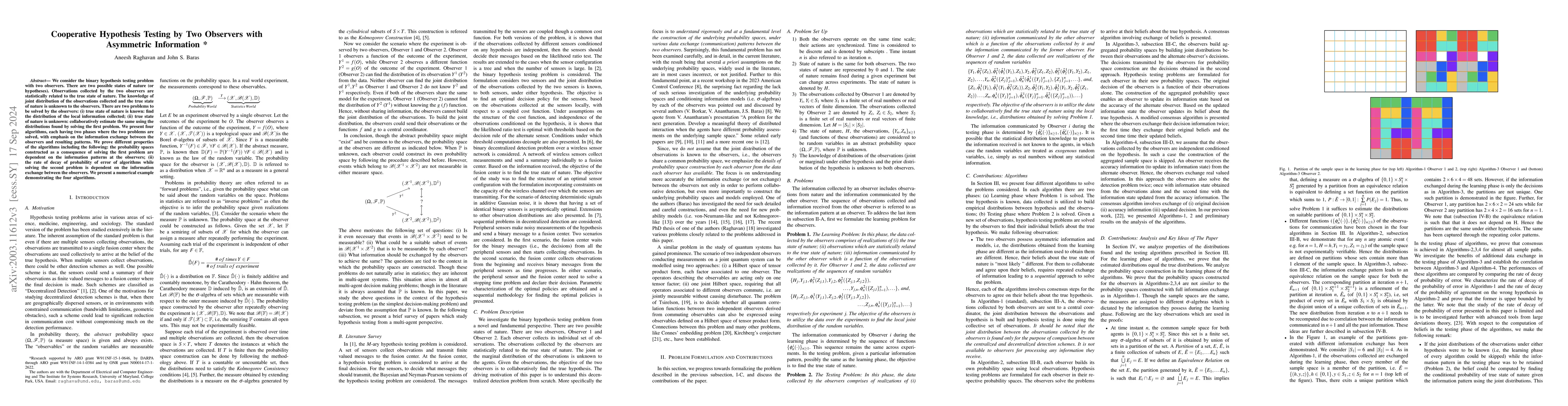 This paper explores cooperative hypothesis testing between two observers with asymmetric information, presenting four approaches: centralized, decentralized, and two hybrid methods. It demonstrates that decentralized approaches can achieve consensus with performance comparable to centralized methods under certain conditions.