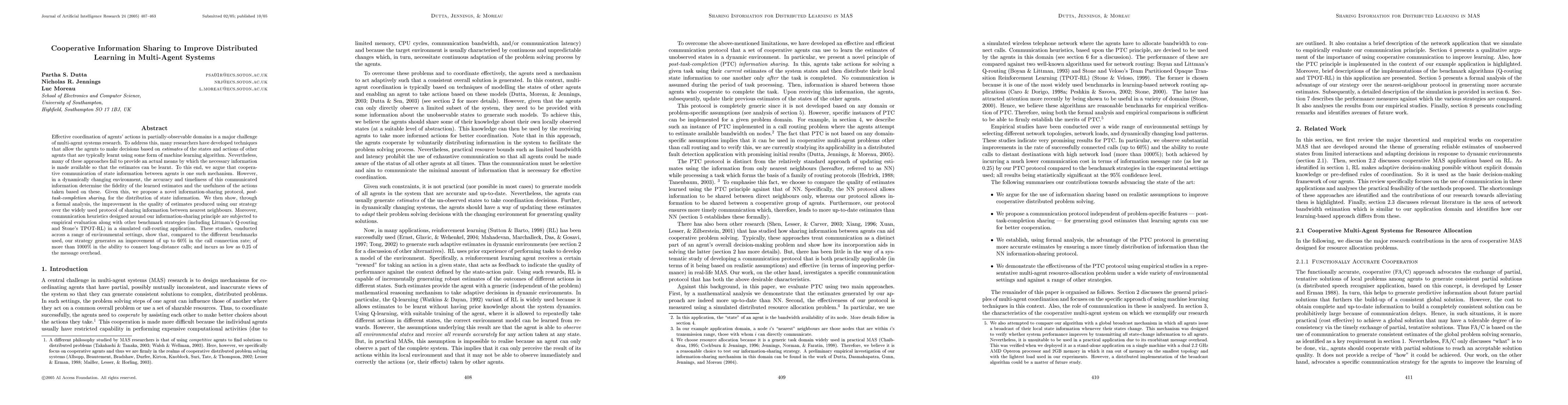 Effective coordination of agents actions in partially-observable domains is a major challenge of multi-agent systems research. To address this, many researchers have developed techniques that allow the agents to make decisions based on estimates of the states and actions of other agents that are typically learnt using some form of machine learning algorithm. Nevertheless, many of these approaches fail to provide an actual means by which the necessary information is made available so that the estimates can be learnt. To this end, we argue that cooperative communication of state information between agents is one such mechanism. However, in a dynamically changing environment, the accuracy and timeliness of this communicated information determine the fidelity of the learned estimates and the usefulness of the actions taken based on these. Given this, we propose a novel information-sharing protocol, post-task-completion sharing, for the distribution of state information. We then show, through a formal analysis, the improvement in the quality of estimates produced using our strategy over the widely used protocol of sharing information between nearest neighbours. Moreover, communication heuristics designed around our information-sharing principle are subjected to empirical evaluation along with other benchmark strategies (including Littmans Q-routing and Stones TPOT-RL) in a simulated call-routing application. These studies, conducted across a range of environmental settings, show that, compared to the different benchmarks used, our strategy generates an improvement of up to 60% in the call connection rate; of more than 1000% in the ability to connect long-distance calls; and incurs as low as 0.25 of the message overhead.